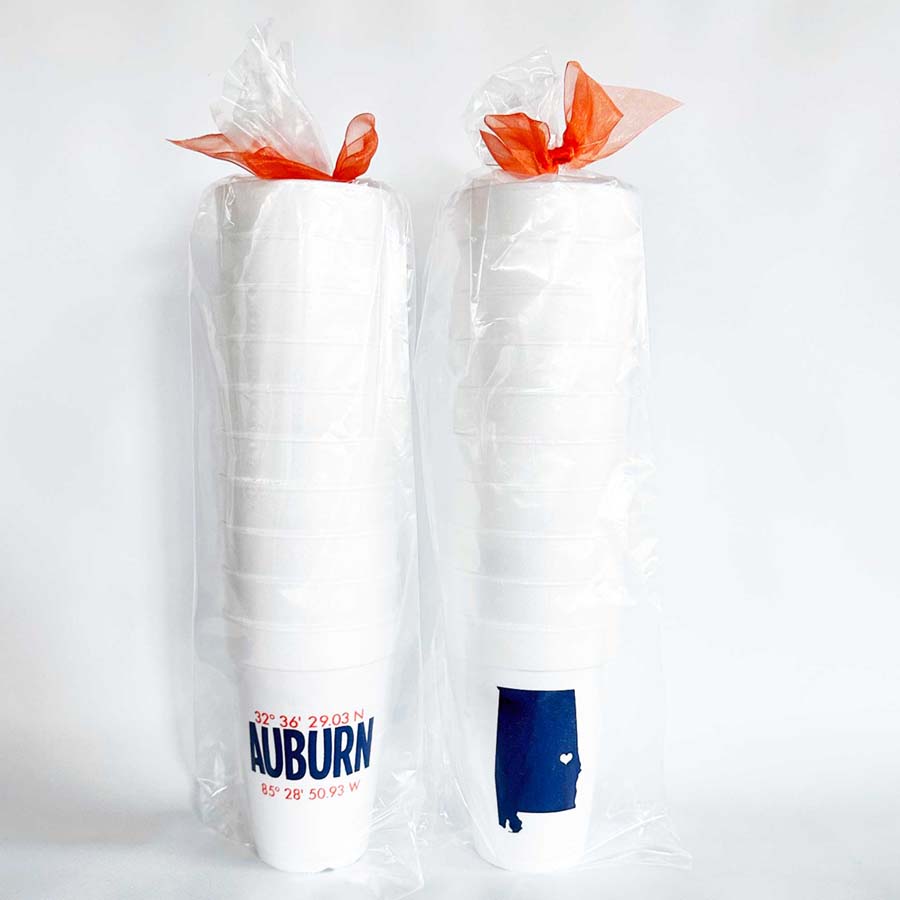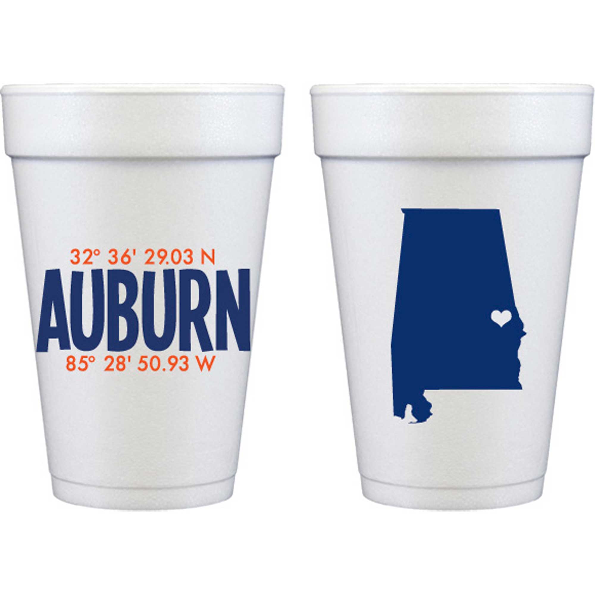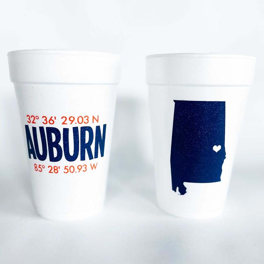 Our Auburn, Alabama GPS coordinate foam cups show the greatest college town with AUBURN written in a fun block font and navy ink and the GPS coordinates displayed in a sleek. modern font using orange ink. Each bag of 10 cups is tied with an orange twist tie ribbon.