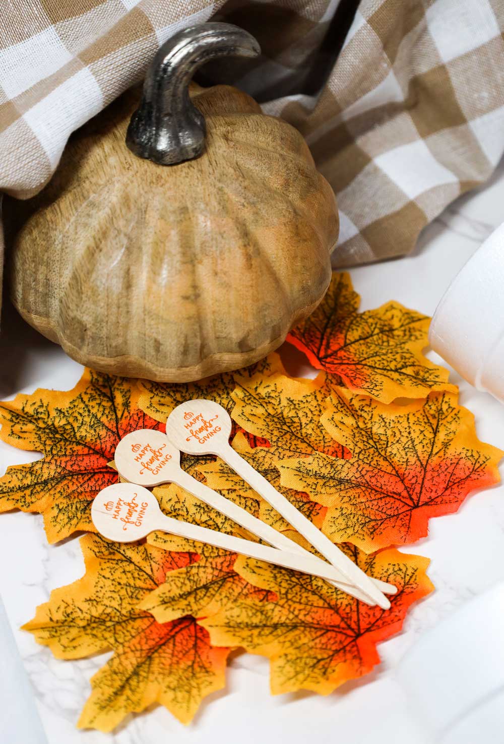 Our pre-printed wood food picks are a cute finishing touch to any charcuterie board or cocktail for your Friendsgiving or Thanksgiving dinner gathering. Each wood food pick is is 4″ long with a round top and dull pointed edge to easily pierce through any fruit, cheese or thin meat.