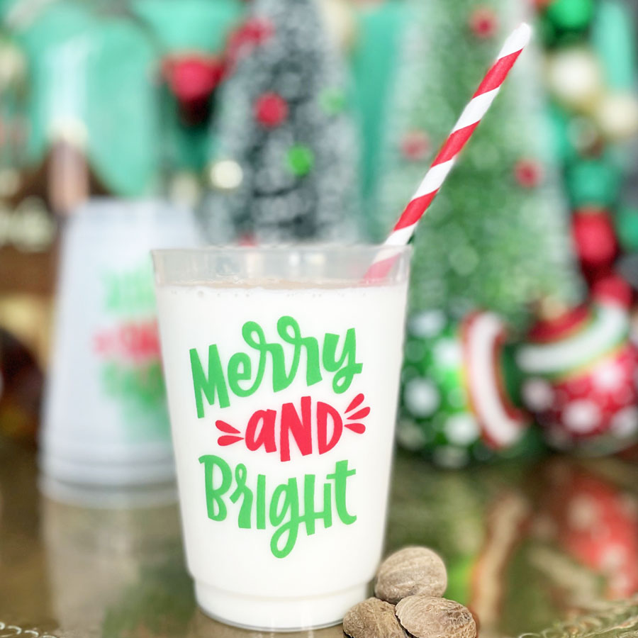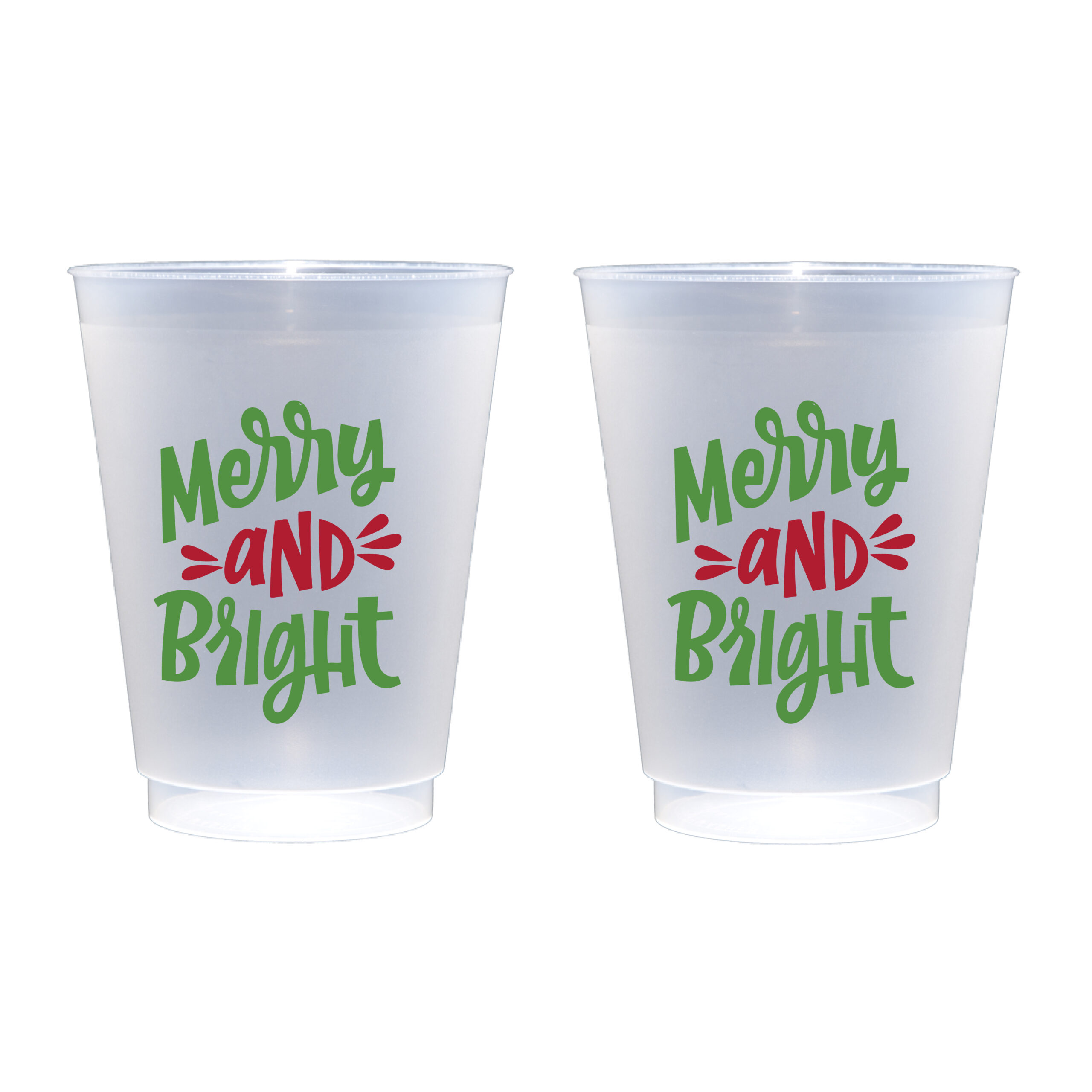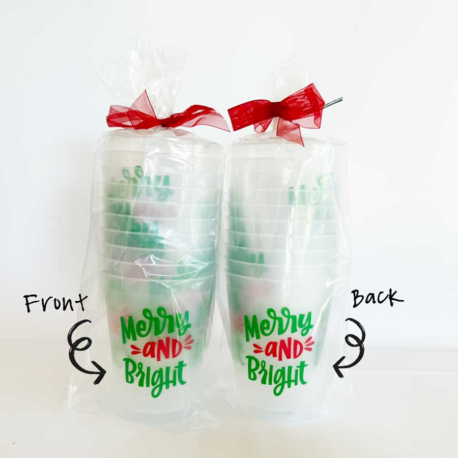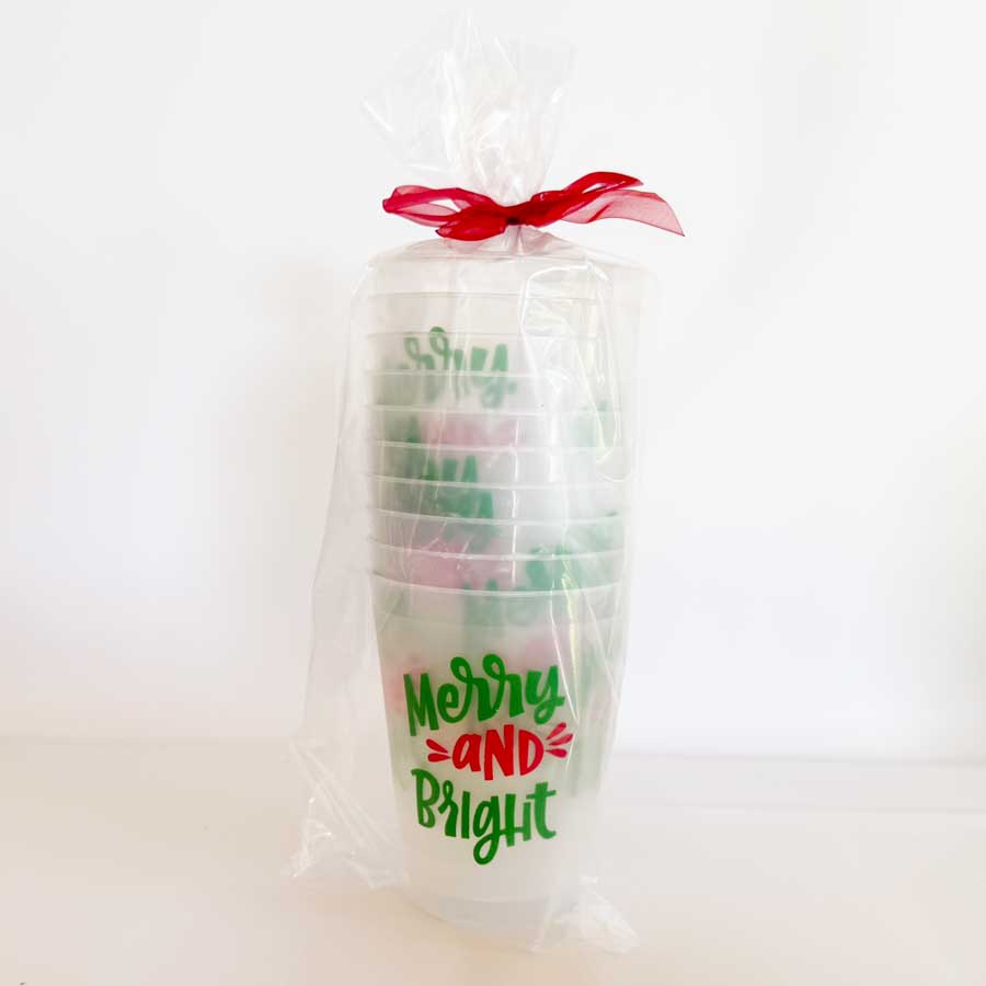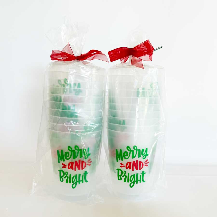 Our 16 ounce holiday frosted roadie cup packs are available in 10 count sleeves. Each cup has “Merry & Bright” printed in a fun hand lettering font. The imprint is on both sides of the disposable foam cup using a Christmas green and red inks. Each sleeve is tied with coordinating ribbon, so they are all ready to give as a gift.