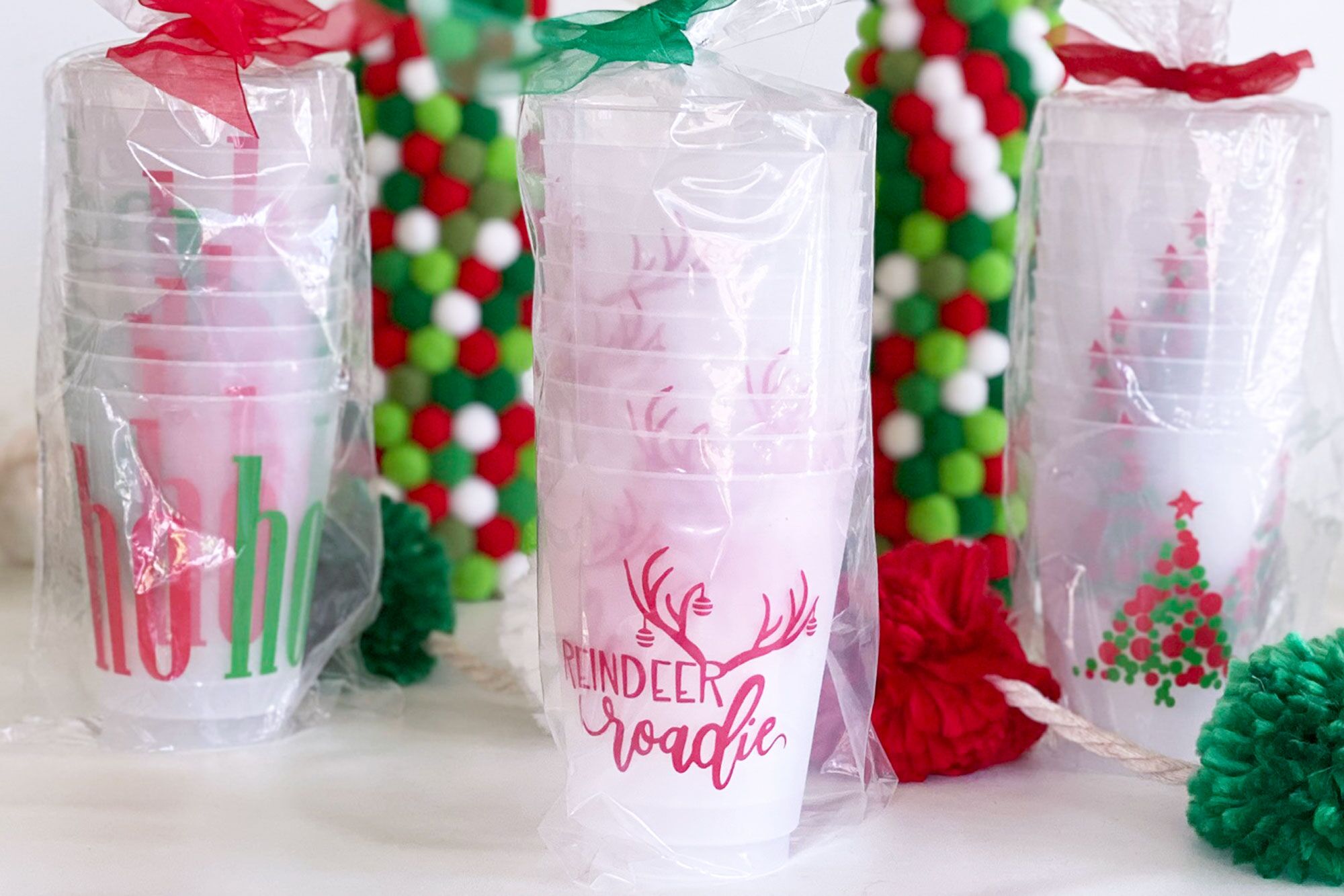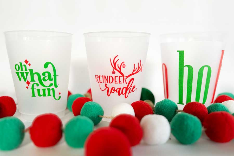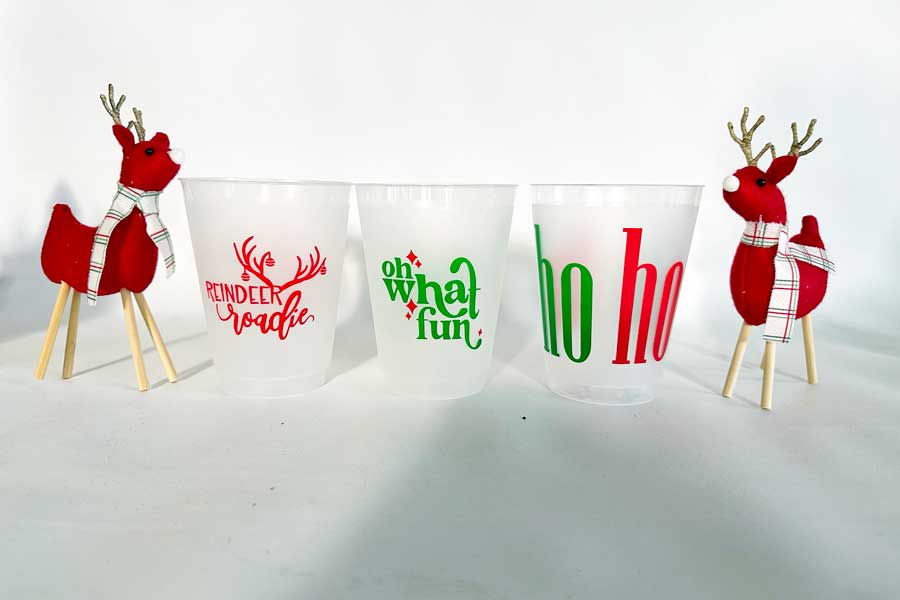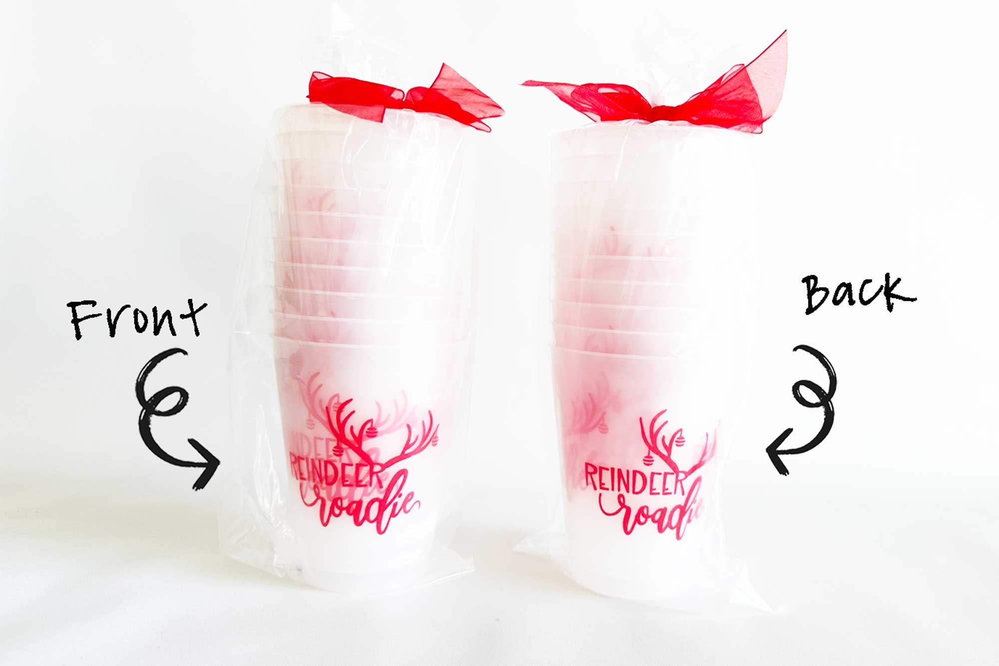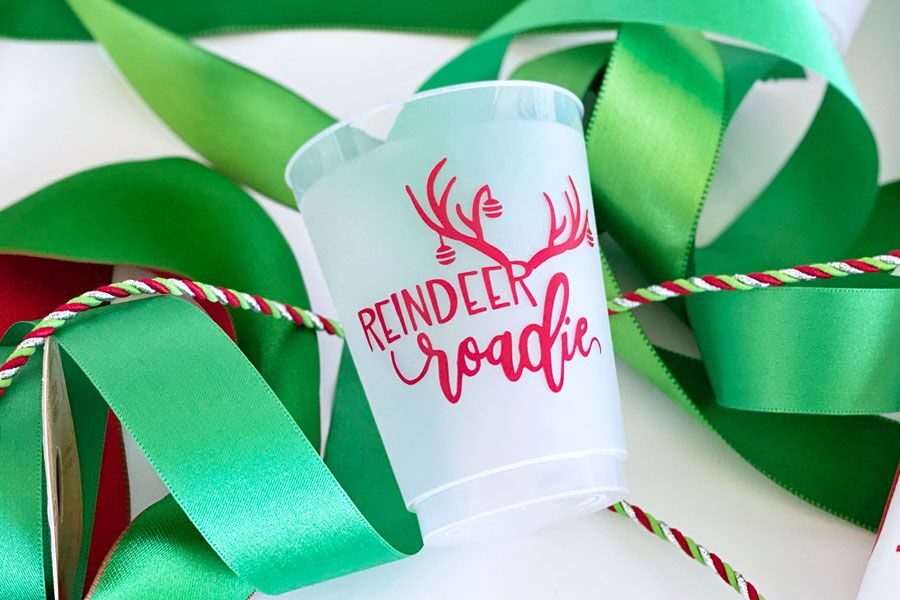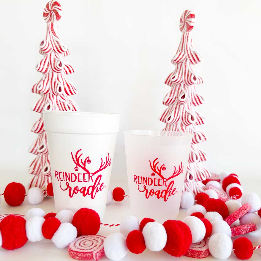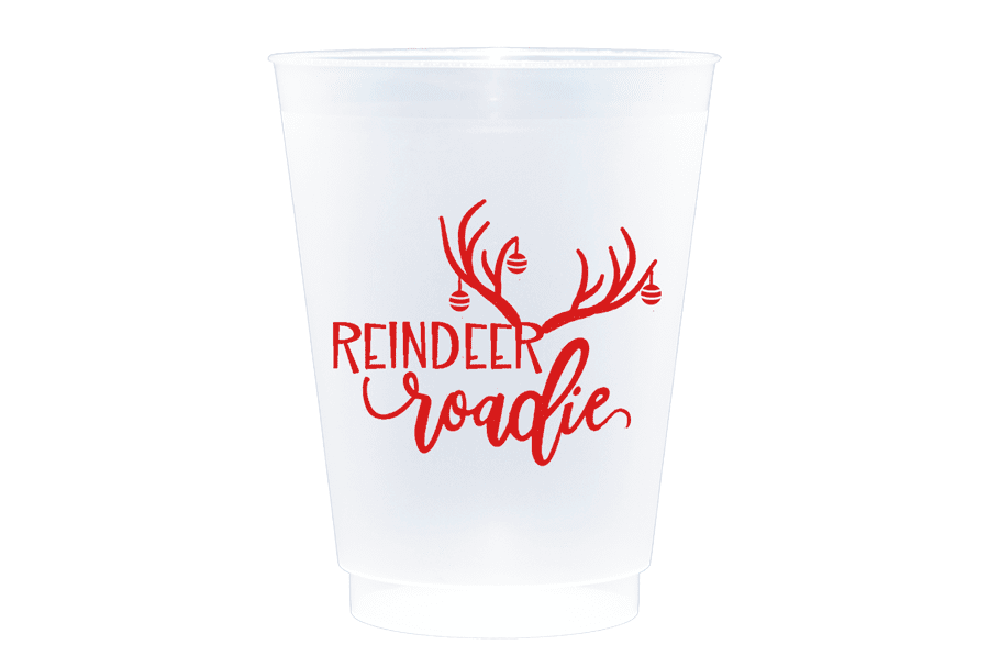 Our 16 ounce holiday shatterproof cup packs are available in 10 count sleeves with our custom “Reindeer Roadie” graphic with Christmas ornaments hanging off the anters.. Each sleeve is tied with coordinating ribbon, so they are all ready to give as a gift.