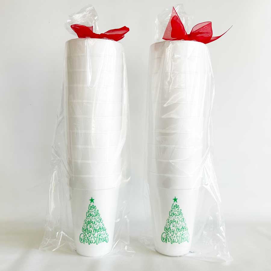 Our 16 ounce holiday foam cup packs are available in 10 count sleeves. Each cup has “we wish you a merry Christmas” printed in a fun hand calligraphy inside the shape of a Christmas tree. The imprint is on both sides of the disposable foam cup using a Christmas green ink. Each sleeve is tied with coordinating ribbon, so they are all ready to give as a gift.