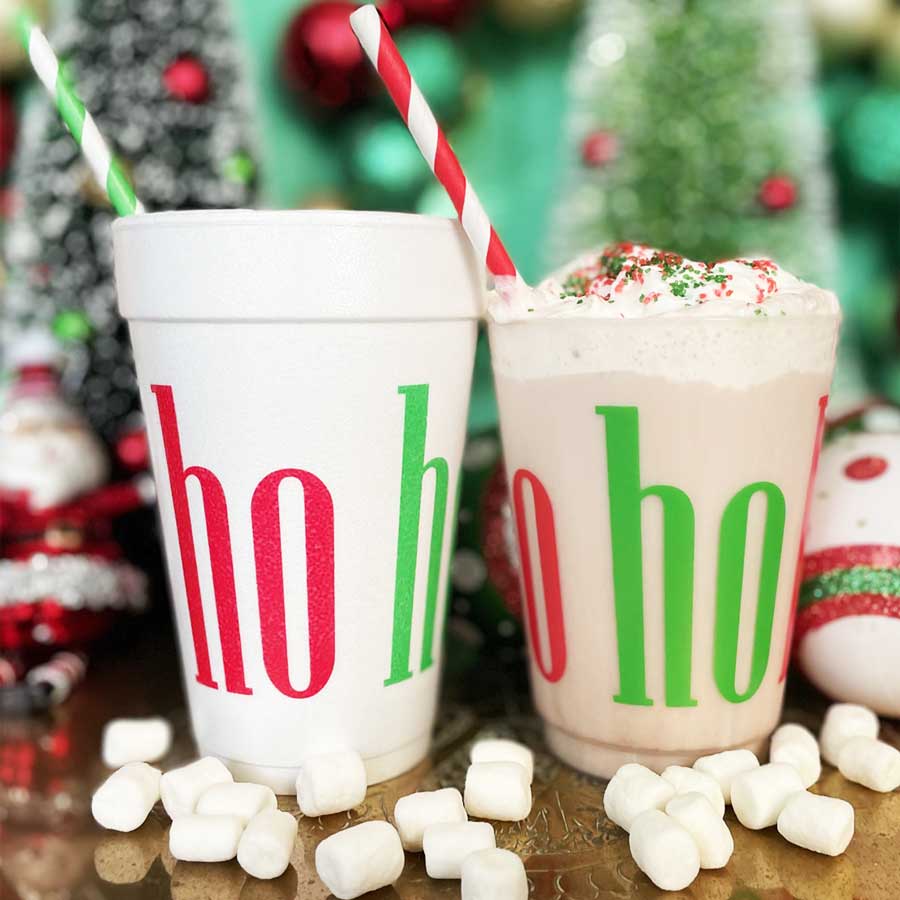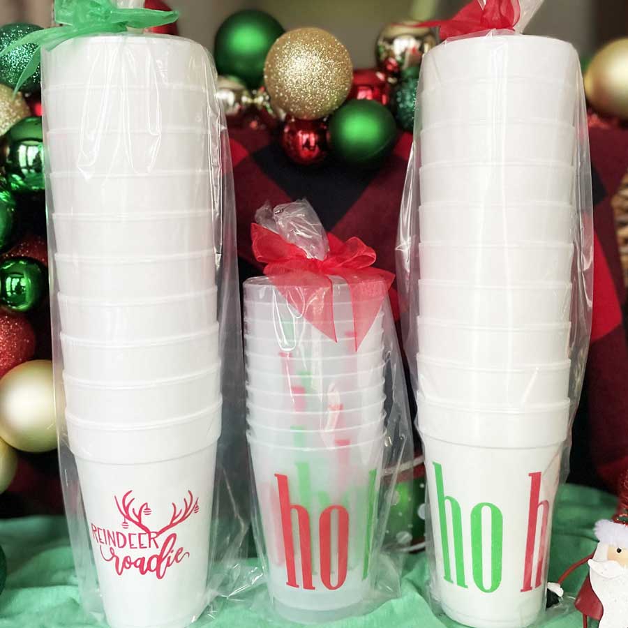 A perfect and affordable addition to your holiday gathering. Our 16 ounce holiday foam cup packs are available in 10 count sleeves. Each cup has “ho ho ho” written around the cup in both red and green ink. Each sleeve is tied with coordinating ribbon, so they are all ready to give as a gift.