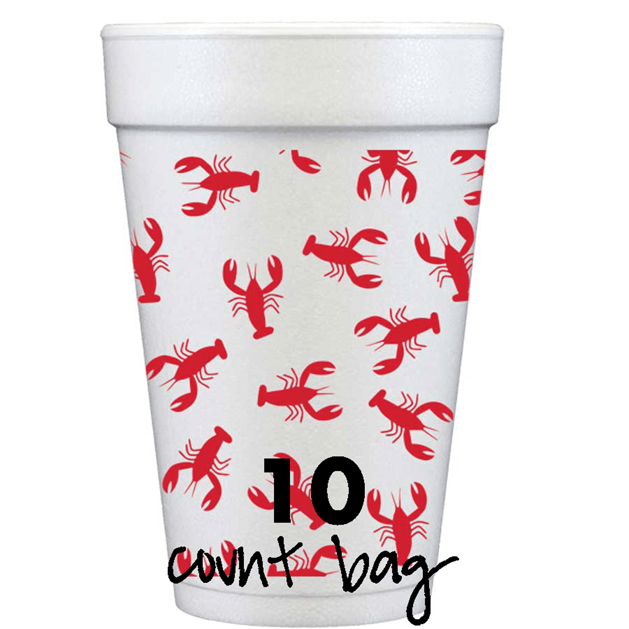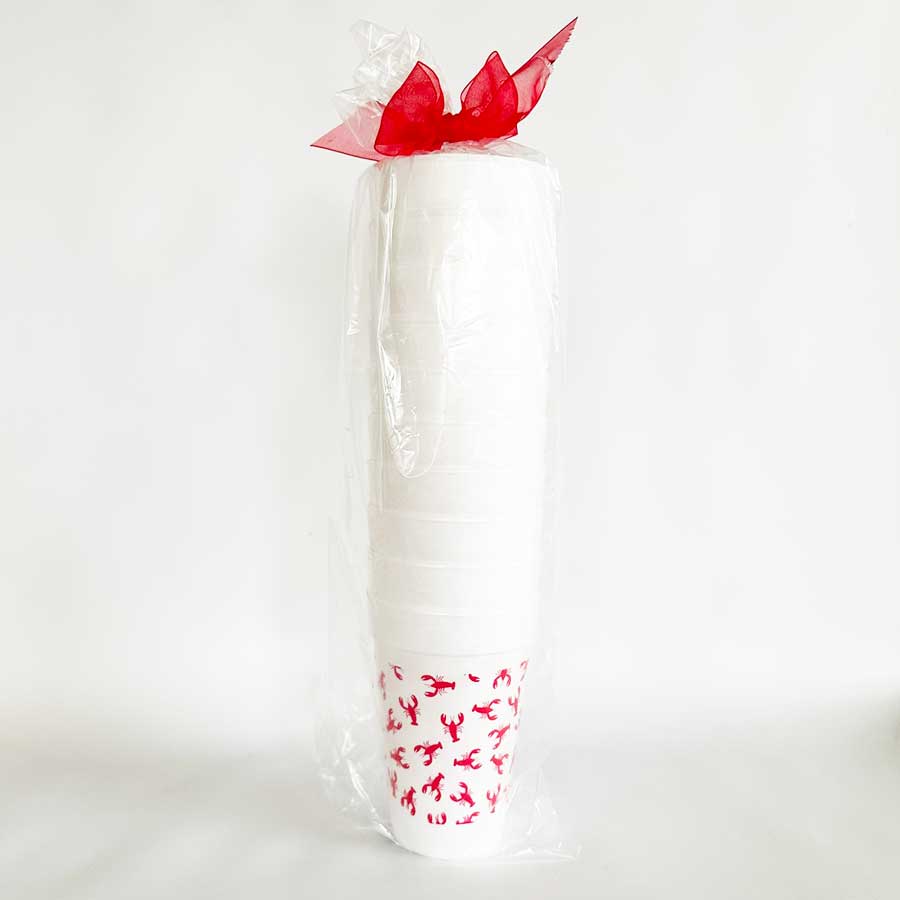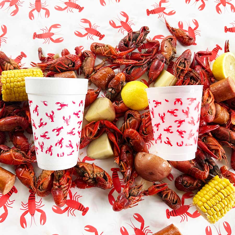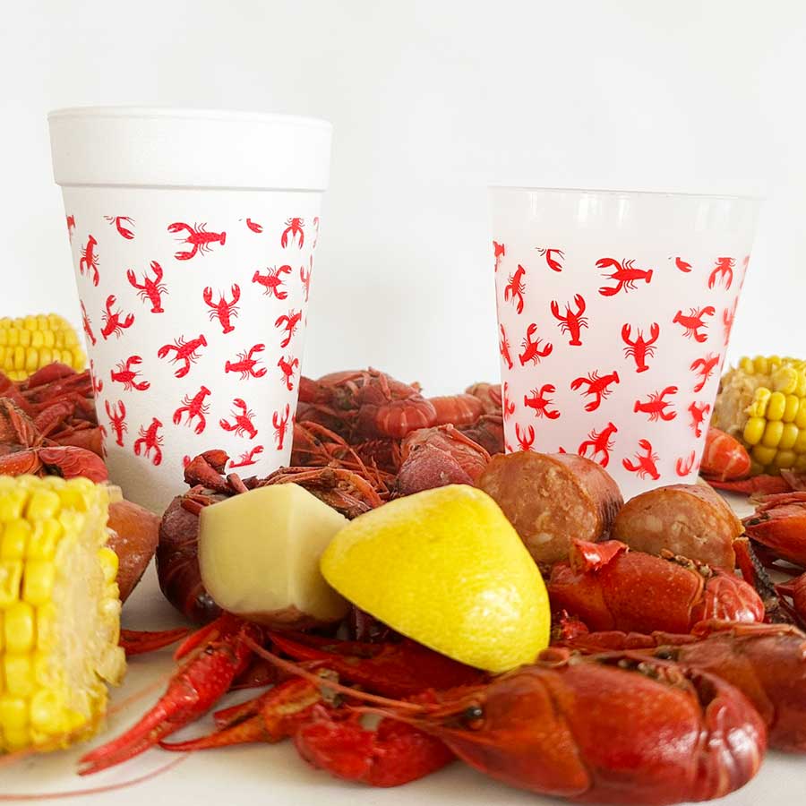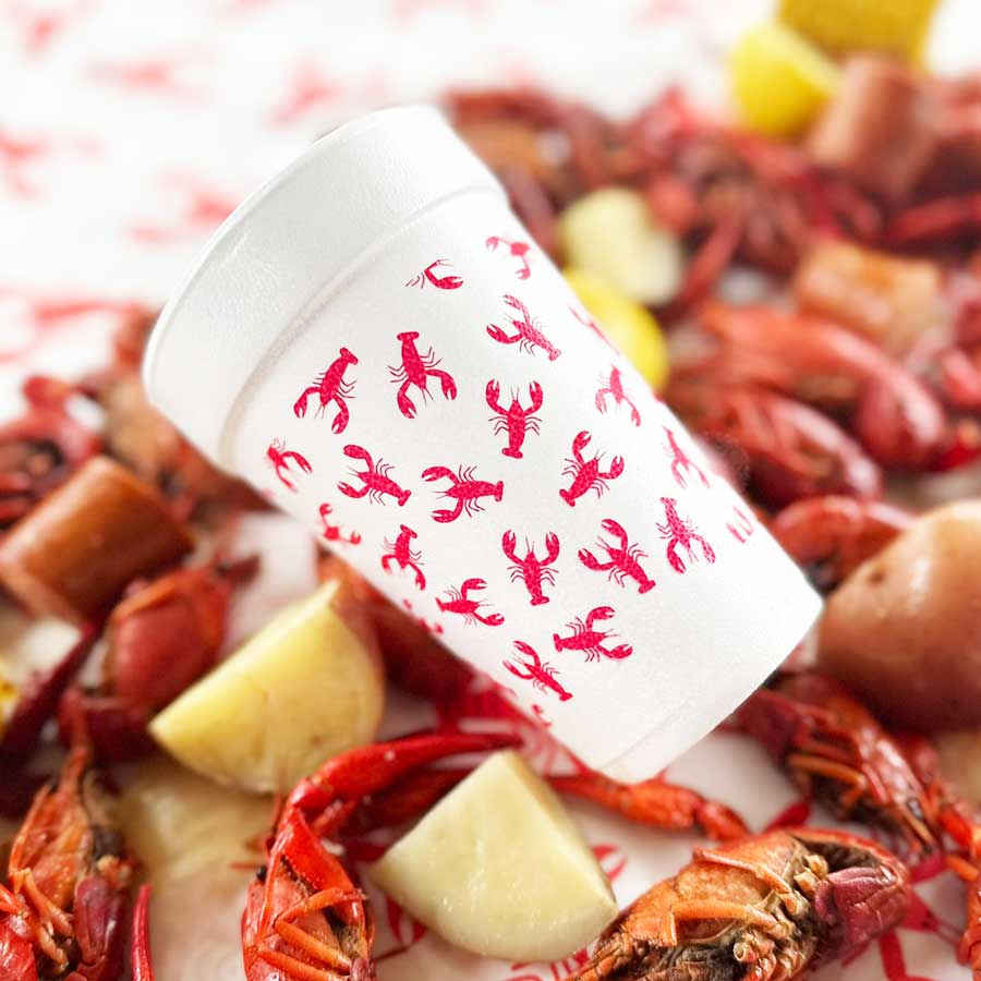 A cute and affordable addition to your crawfish boil gathering, our crawfish wrap styrofoam cups are 16 oz cups with the red crawfish imprint shown wrapped around the cup. Sold in sleeves of 10 cups, you can’t find a cuter crawfish boil foam cup. We also have this crawfish design in a in frosted shatterproof cup. These crawfish boil foam cups pair great with our Crawfish Wax Coated Paper Roll Table Cover