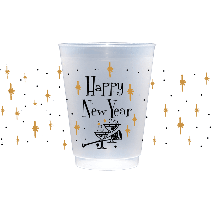 A perfect and affordable addition to your holiday gathering. Our 16 ounce Happy New Year shatterproof cup packs are available in 10 count sleeves. Printed in black and gold ink, these cups displace a cute New Year’s image with gold stars and black dots wrapping the entire cup.