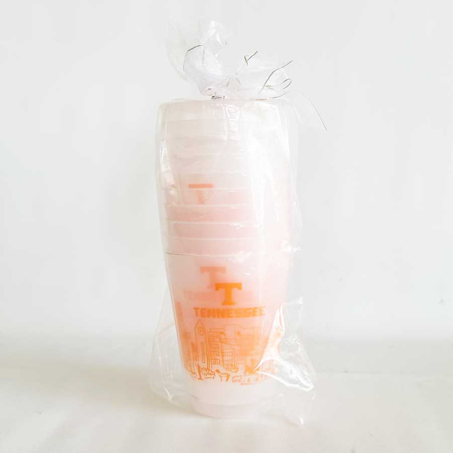 Our 16-ounce foam cup packs are pre-printed with the design shown in orange ink and are available in 10 count sleeves. Each sleeve is tied so you can give as a gift or take to your football tailgate or Vols graduation party. This frosted shatterproof cup is our most popular size and can be served across a variety of drinks including beer, mixed drinks or any drink needing ice.