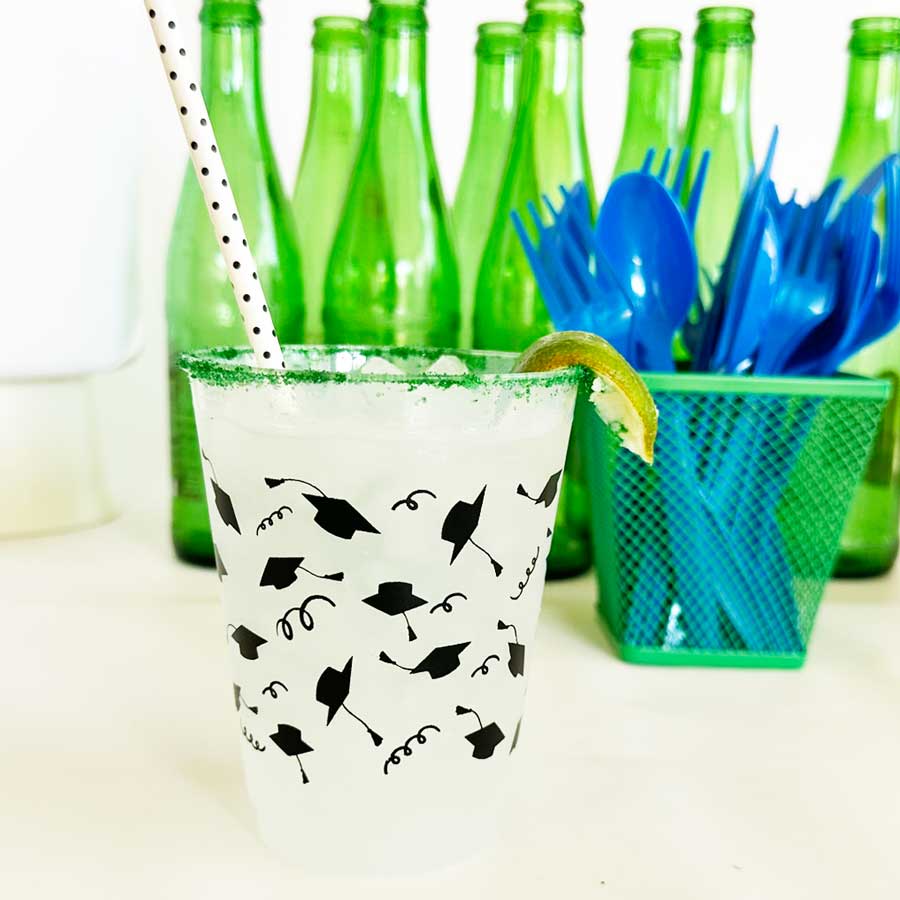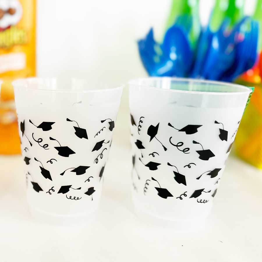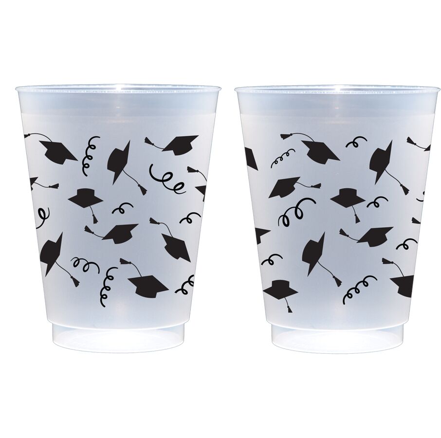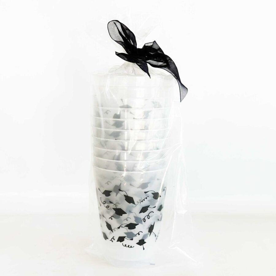 A perfect and affordable addition to your graduation party. Our 16 ounce graduation plastic shatterproof frosted cup packs are available in 10 count sleeves. Each cup has our cute graduation cap icons wrapped with streamers around each cup in black ink. Each sleeve is tied with a black twis