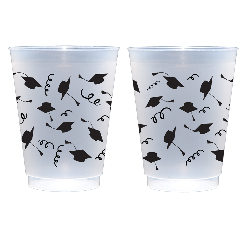 A perfect and affordable addition to your graduation party. Our 16 ounce graduation plastic shatterproof frosted cup packs are available in 10 count sleeves. Each cup has our cute graduation cap icons wrapped with streamers around each cup in black ink. Each sleeve is tied with a black twis