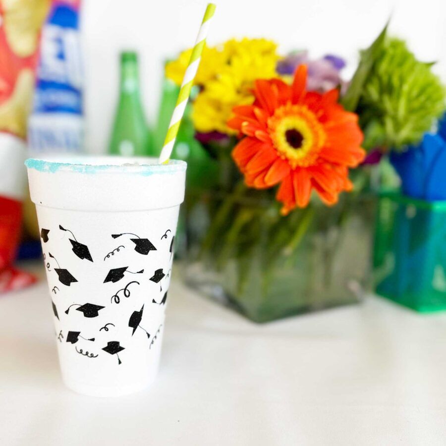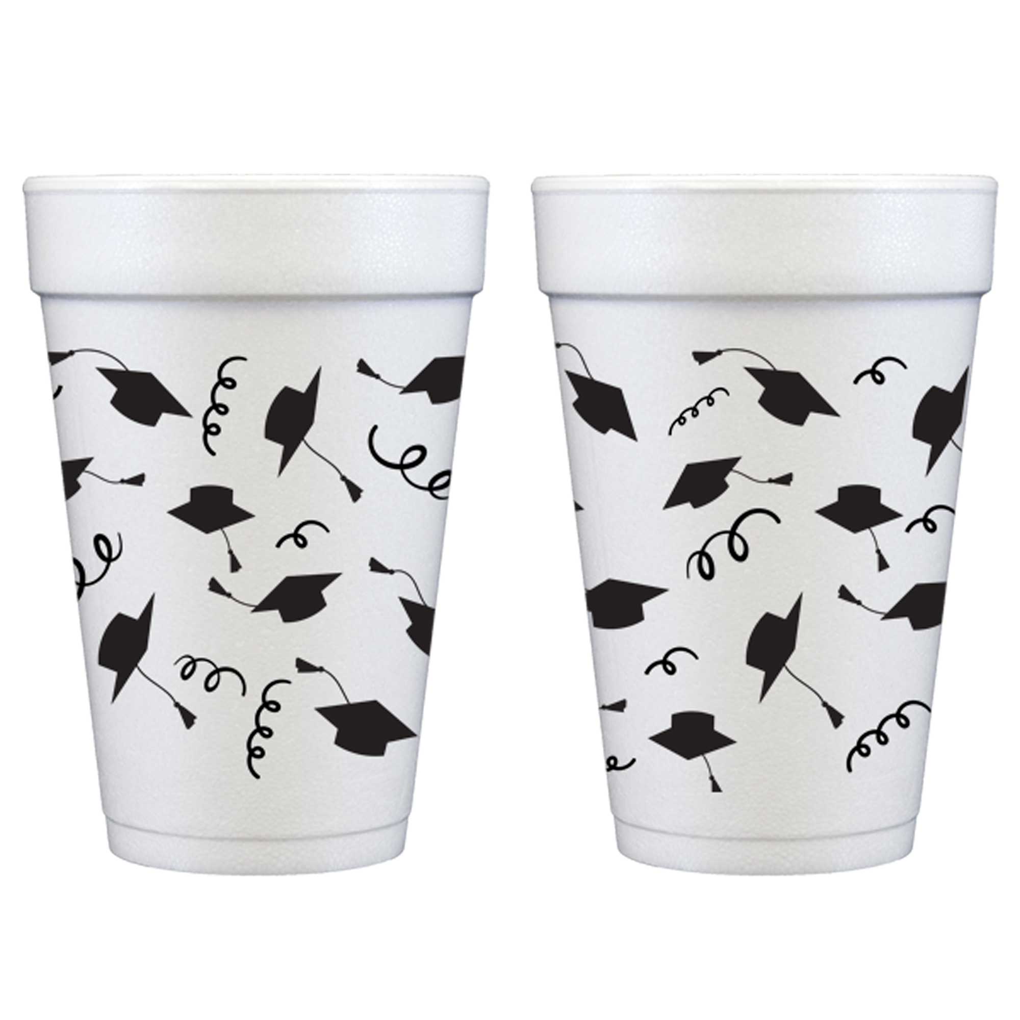 A perfect and affordable addition to your graduation party. Our 16 ounce graduation foam cup packs are available in 10 count sleeves. Each cup has our cute graduation cap icons wrapped around each cup in black ink.. Each sleeve is tied with a twist tie