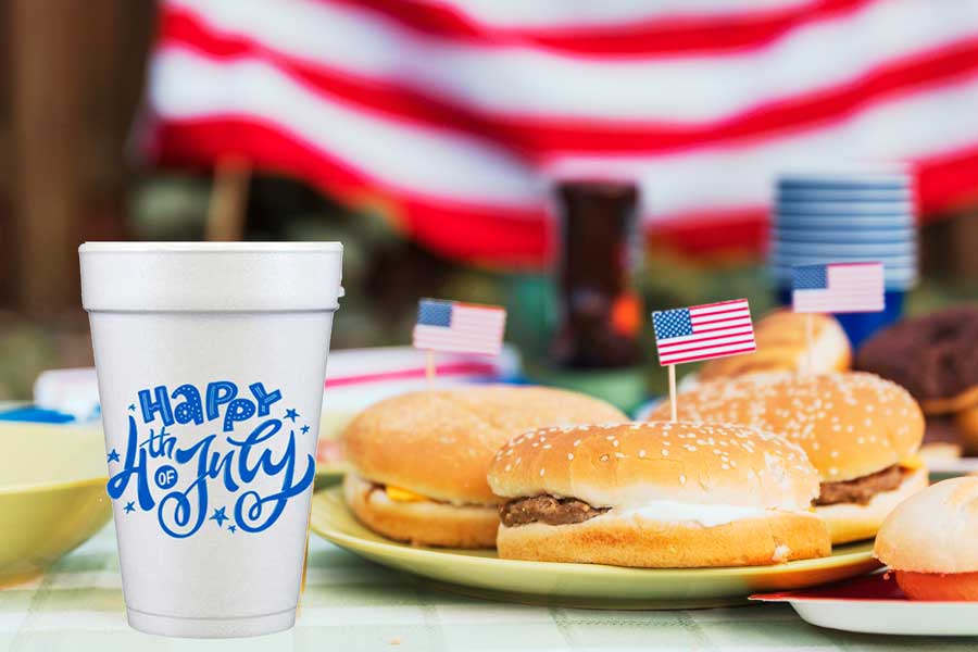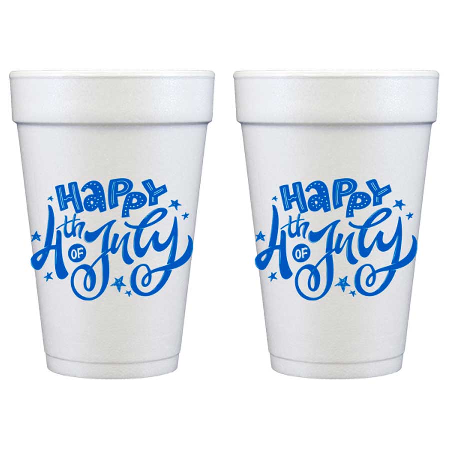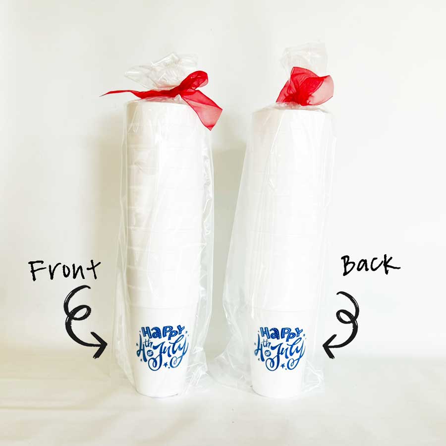 These patriotic foam cups are so handy to have around for everyone’s favorite outdoor BBQ holiday – and so cute with “Happy 4th of July” written in royal blue ink in mix fonts with stars scattered around the text. This foam cup is our most popular size and can be served across a variety of drinks including beer, mixed drinks or any drink needing ice.