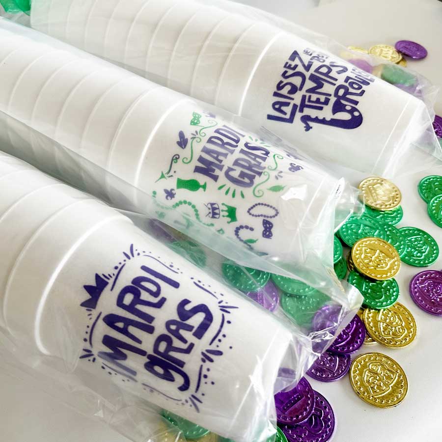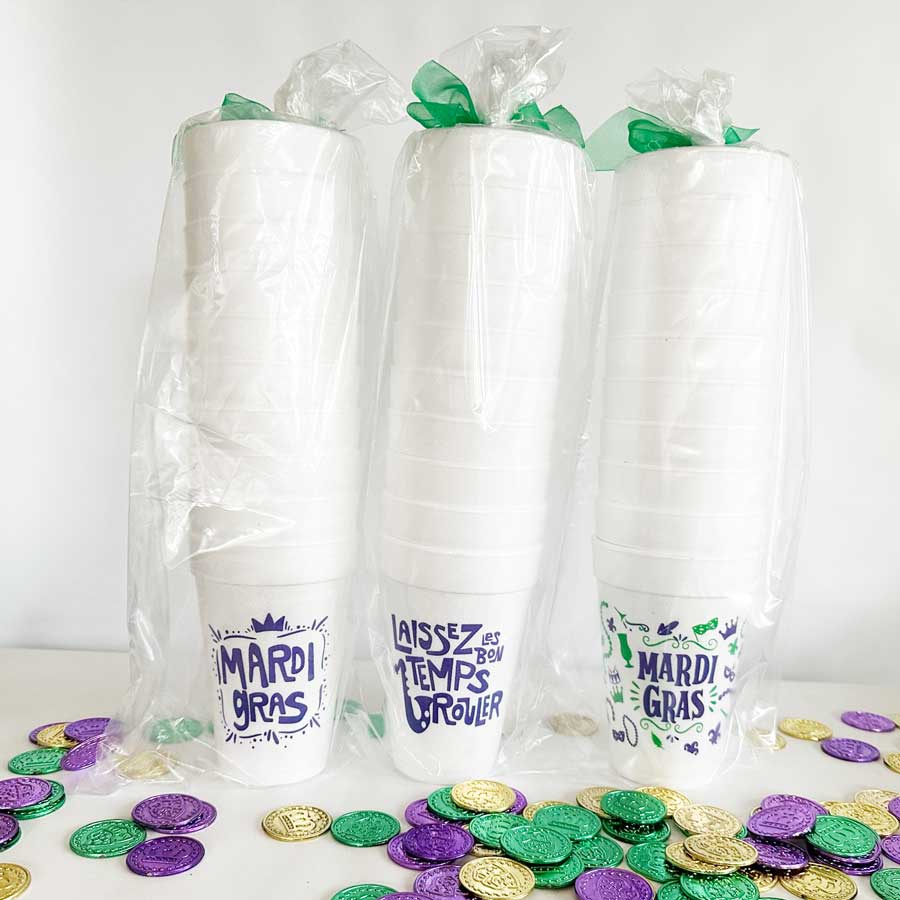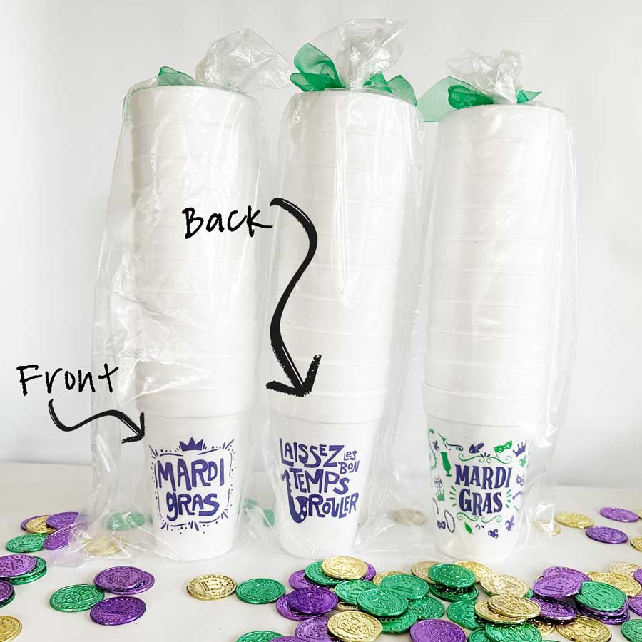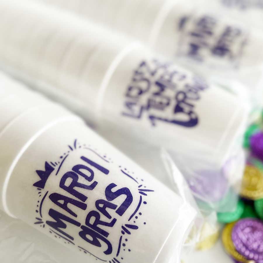 Our Mardi Gras 16 ounce foam cups are have “Laissez Les Bon Temps Rouler” (Let the Good Times Roll) on one side and “Mardi Gras” in a similar font and fun frame on the opposite side. Both sides are printed in purple ink and tied with a twist tie ribbon. The smallest order we can personalize is 25 cups, but we can replicate this design and put personalization on the other side of the cup or add it somewhere to the design you see.
