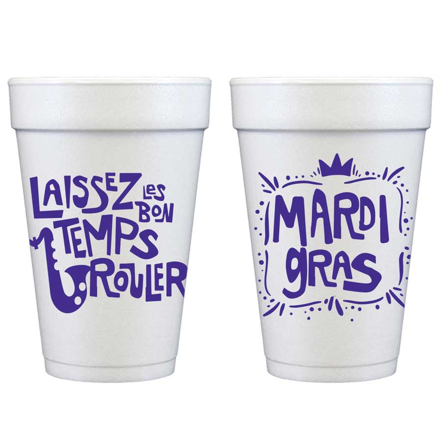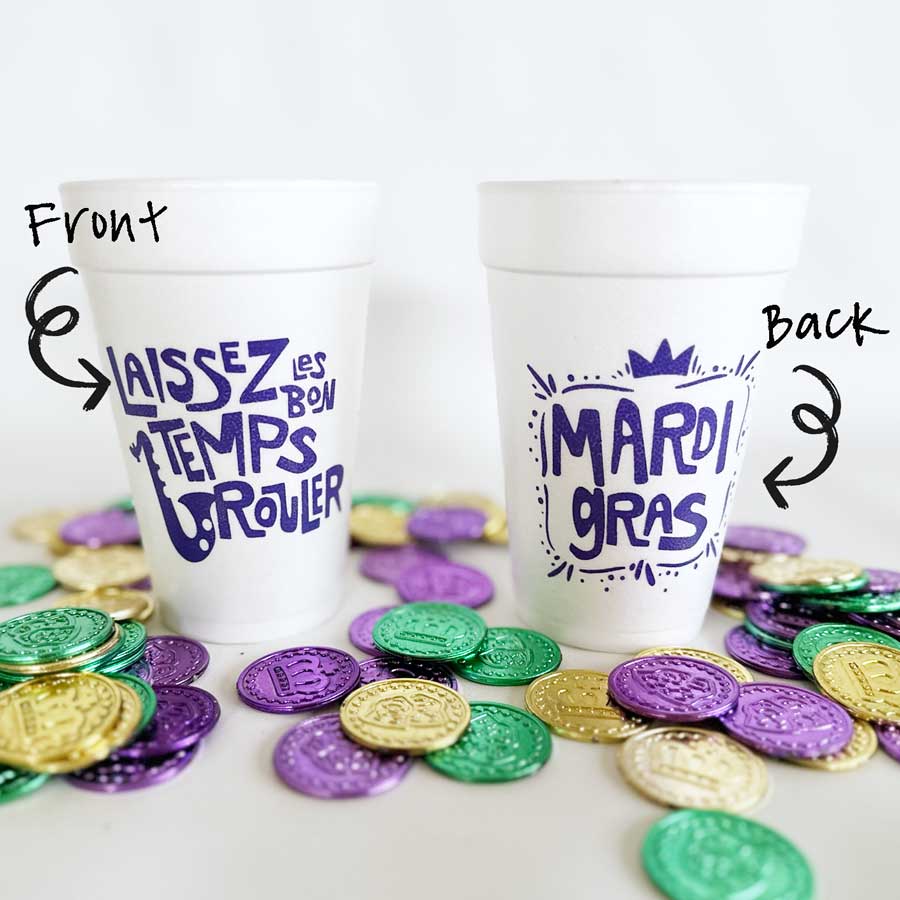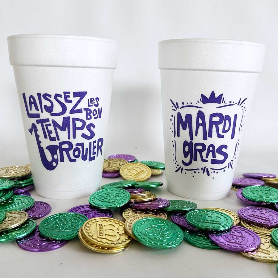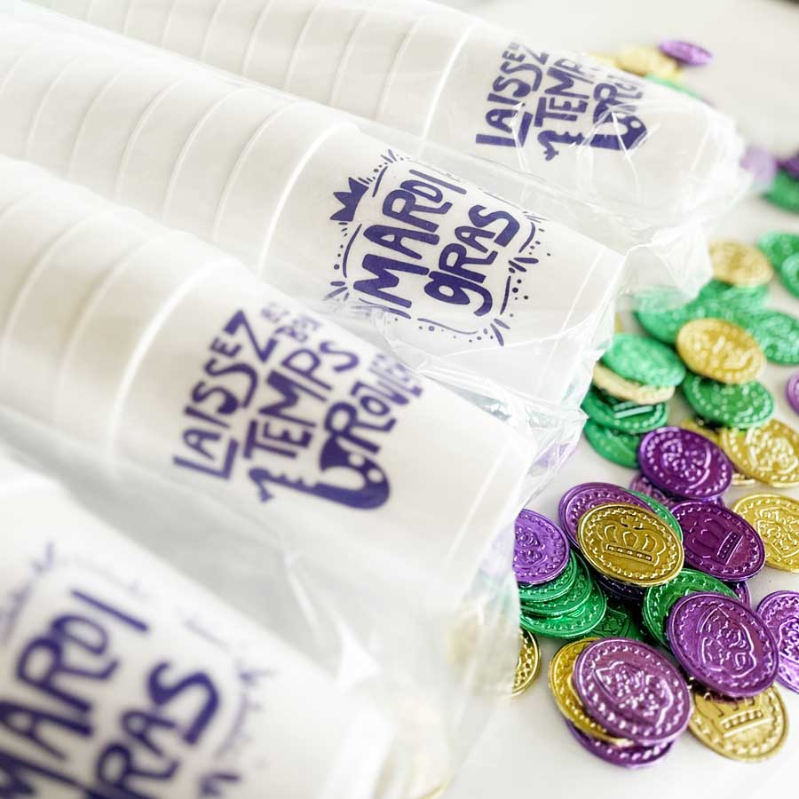 Our Mardi Gras 16 ounce foam cups are have “Laissez Les Bon Temps Rouler” (Let the Good Times Roll) on one side and “Mardi Gras” in a similar font and fun frame on the opposite side. Both sides are printed in purple ink and tied with a twist tie ribbon. The smallest order we can personalize is 25 cups, but we can replicate this design and put personalization on the other side of the cup or add it somewhere to the design you see.