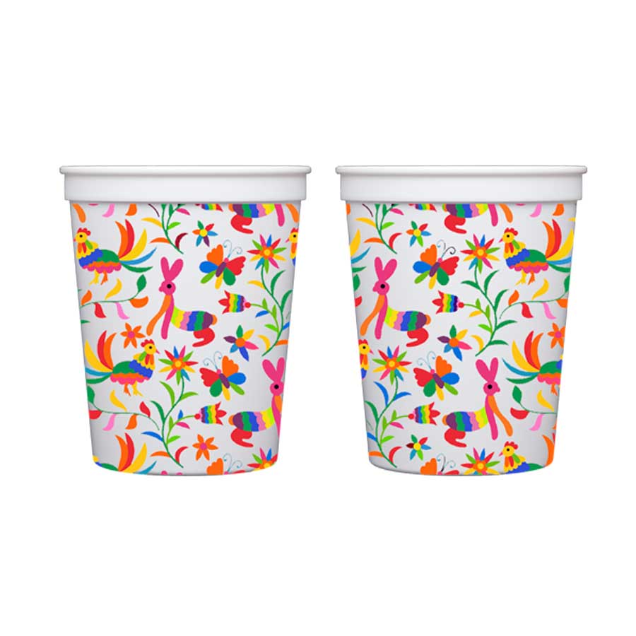 Our Mexican embroidery/Otomi design is printed on white 16 oz stadium party cups and are the finishing touch to your Mexican fiesta or Cinco de Mayo party. These cups come in a sleeve of 10 and each cup is wrapped in our colorful Mexican embroidery/Otomi design with brightly colored rabbits roosters, butterflies, flowers and leaves. These also look great on a table with our luncheon sized otomi print napkins.