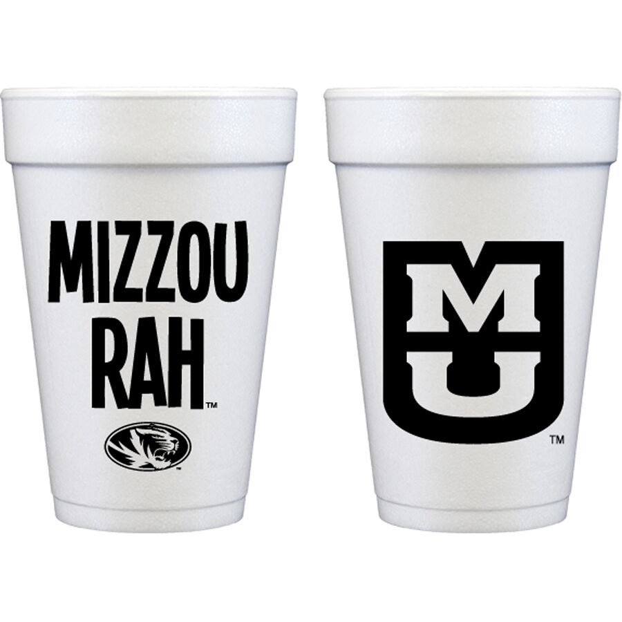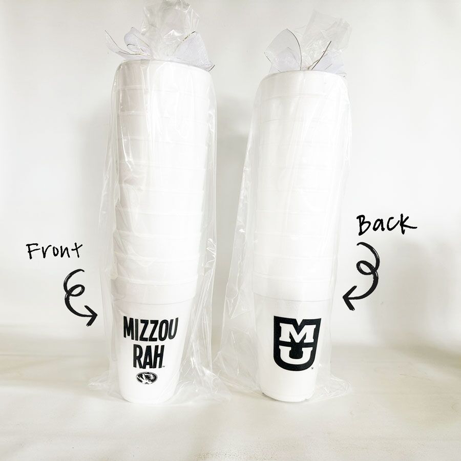 A sleeve of ten 16 oz styrofoam foam cups with the Mizzou/University of Missouri logo on one side and “MIZZOU RAH” on the other side of each cup.