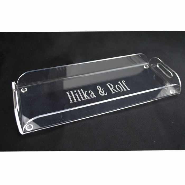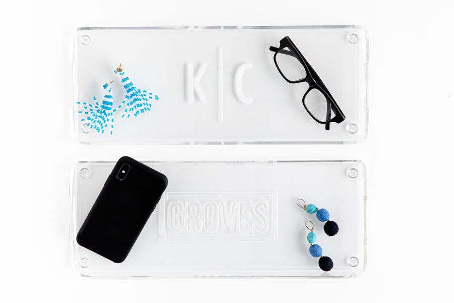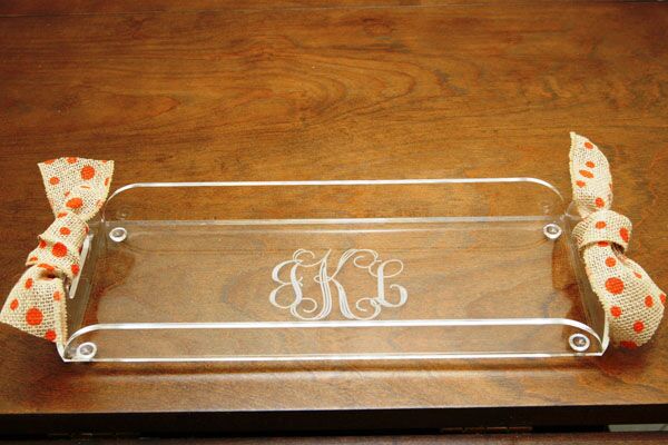 Our monogrammed acrylic trays add an elegant touch to any bedroom or bathroom vanity. Measuring at 16″ x 6″, these vanity trays are the perfect gift for your favorite graduate, friend or bride. The tray includes a monogram, single initial or name in the style of your choice. These clear personalized trays with monogram are engraved (not a vinyl monogram that will peel off).