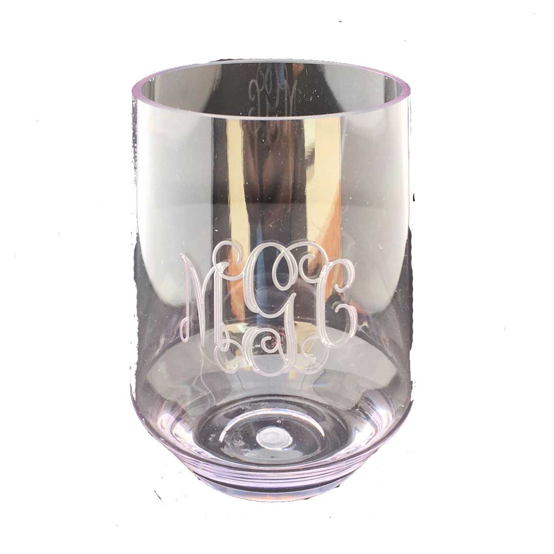 The monograms are engraved (not a vinyl monogram that will peel off). and are perfect for casual entertaining and durable enough for everyday use. These glasses are virtually unbreakable and have a low center of gravity which makes them ideal for avoiding accidental spills, especially on uneven surfaces such as grass. This plastic wine glass can hold 19 oz of liquid to capacity (think like a measuring cup) and is laser engraved with a monogram or personalized with a name or message for a thoughtful gift.