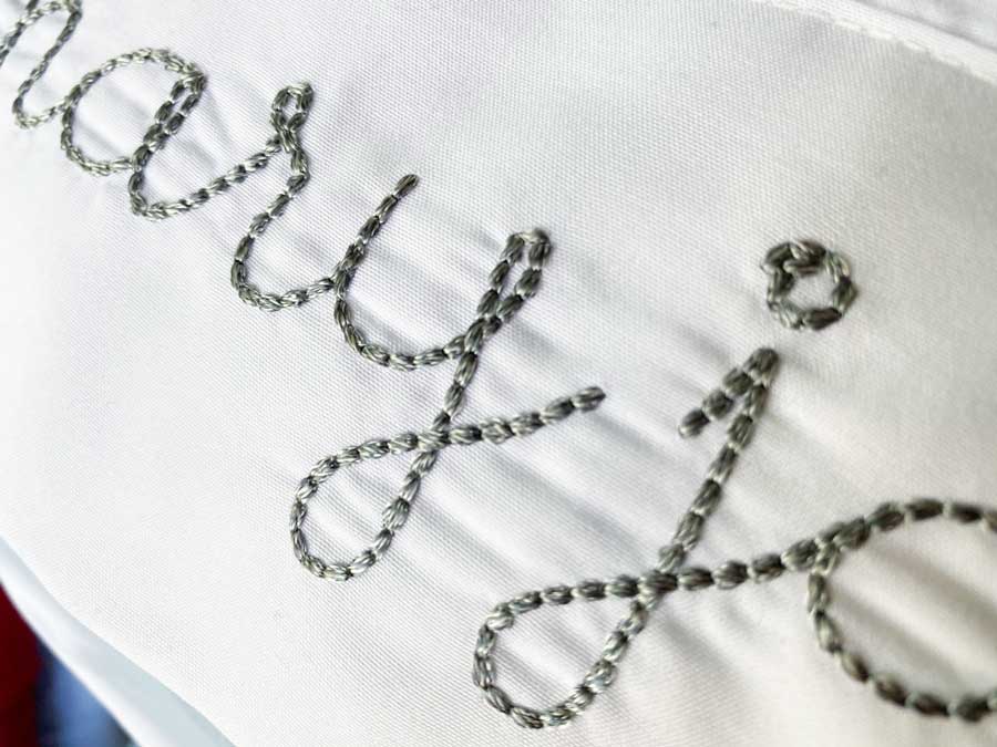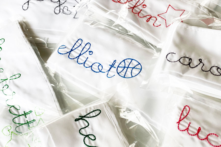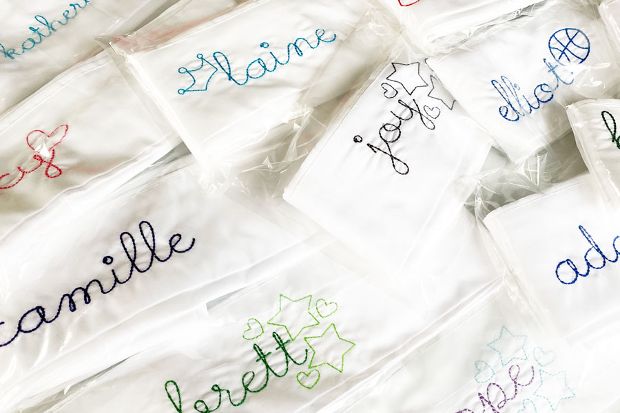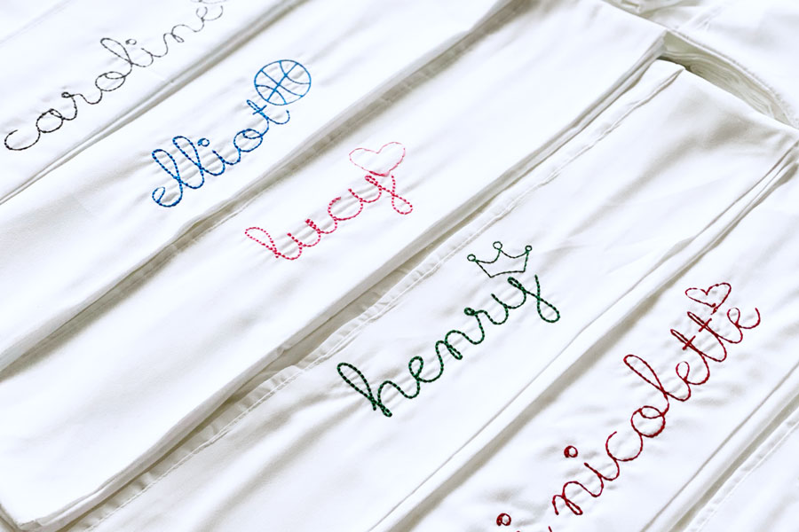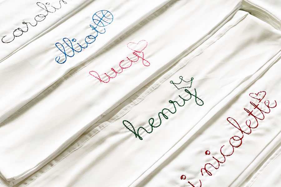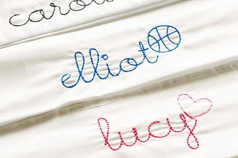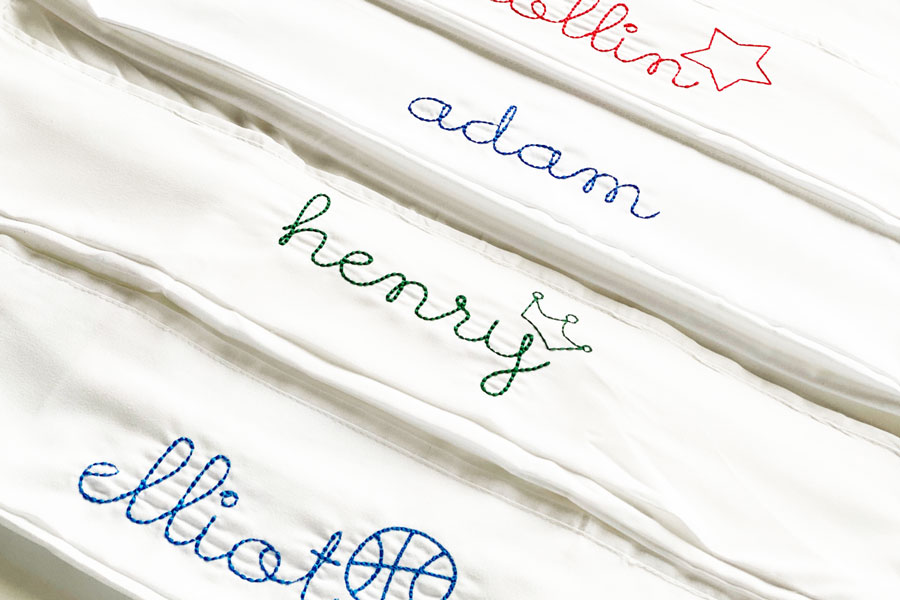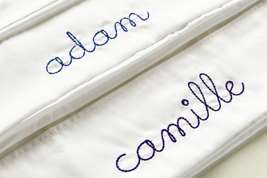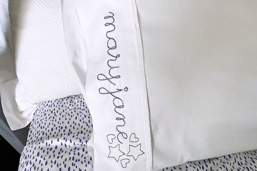 Create a personalized standard bed pillowcase personalized with the name, monogram and/or graphic. Lettering will be sized based on lettering, but should be around 2″ tall and will be placed as shown on the open flap of the pillowcase. Photo shows our on-trend hand stitched embroidery font and graphic, but you can pick any font or graphic from our stock font and stock image library.