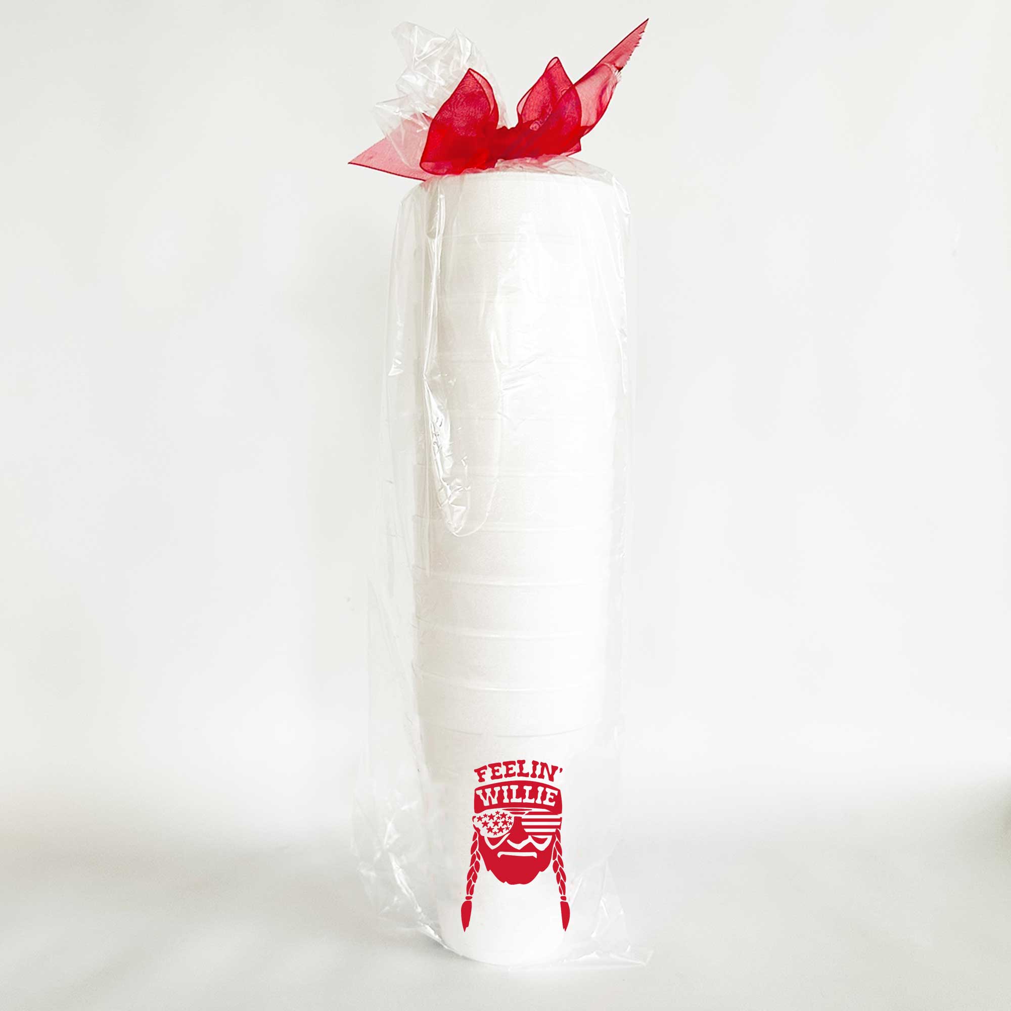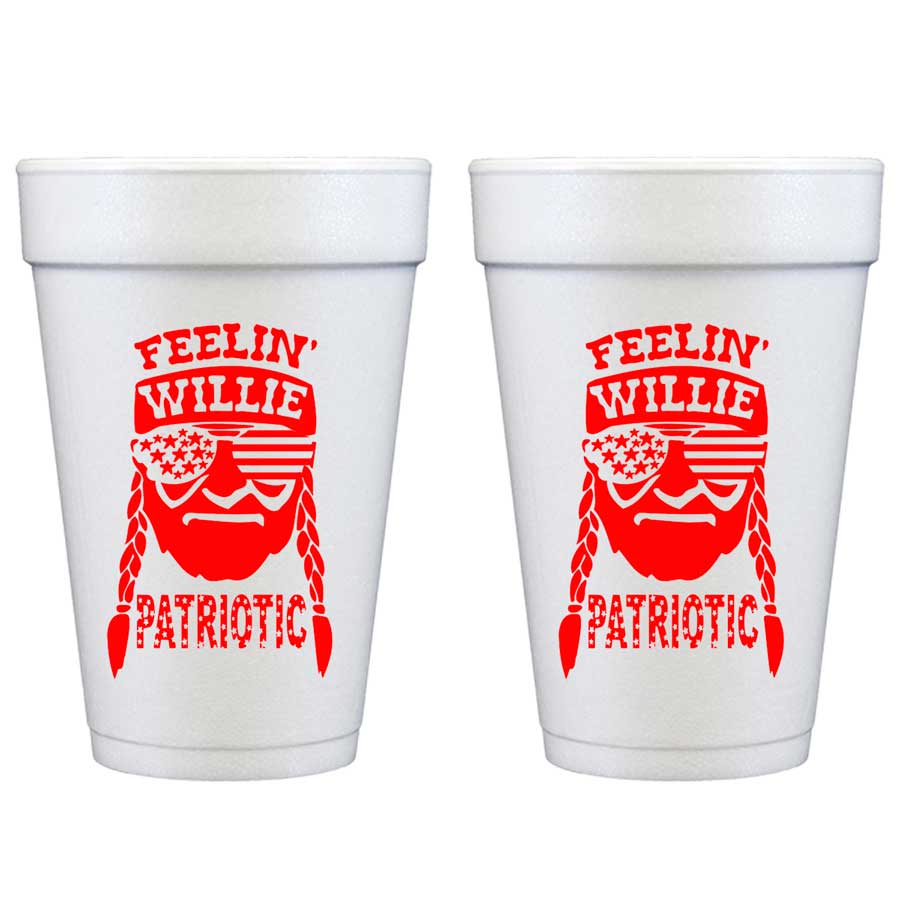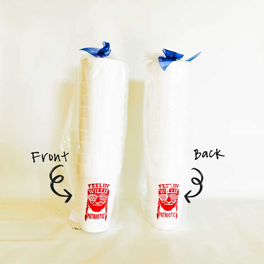 These patriotic foam cups are so handy to have around for everyone’s favorite outdoor BBQ holiday – and so cute with “I’m Feelin’ Willie Patriotic” written in red ink with America’s favorite singer. This foam cup is our most popular size and can be served across a variety of drinks including beer, mixed drinks or any drink needing ice.