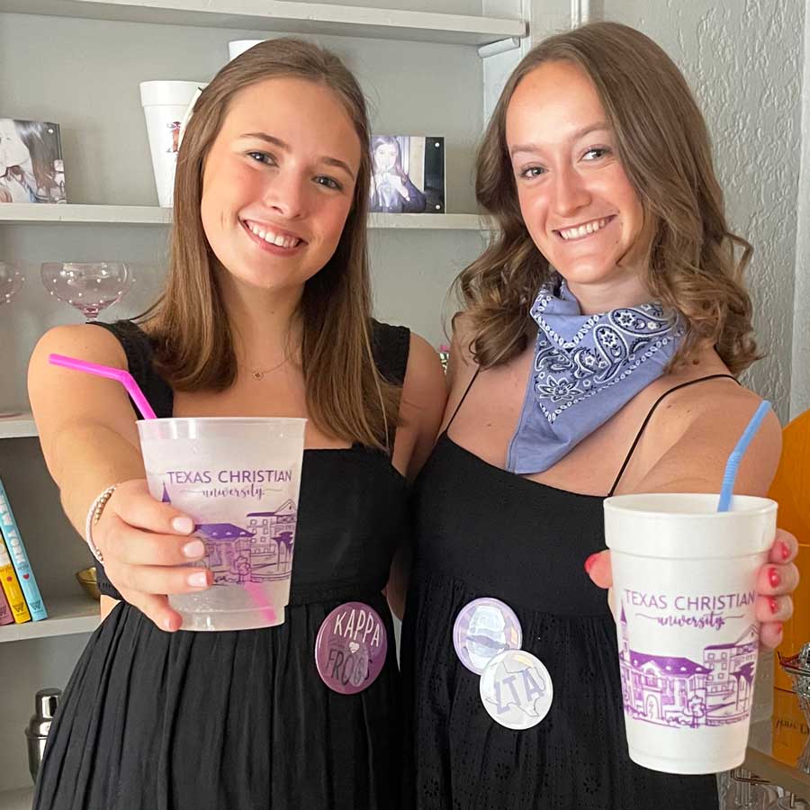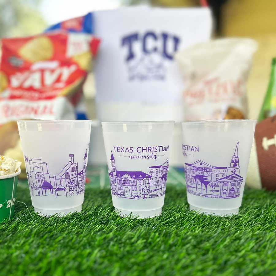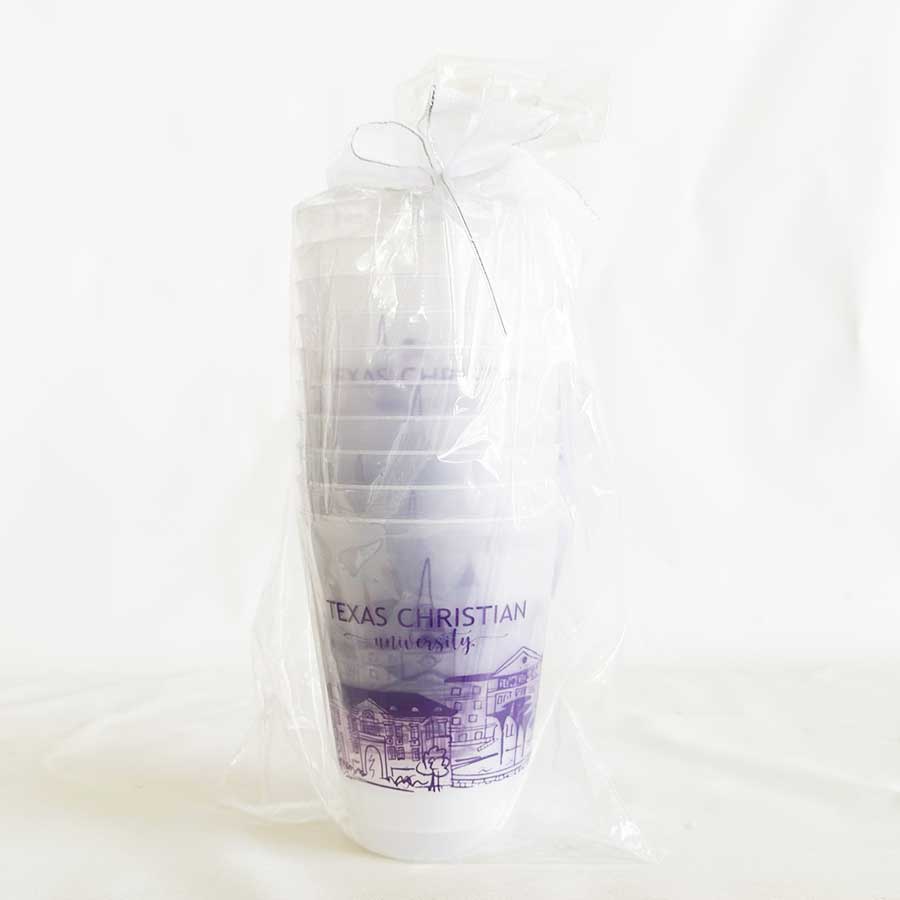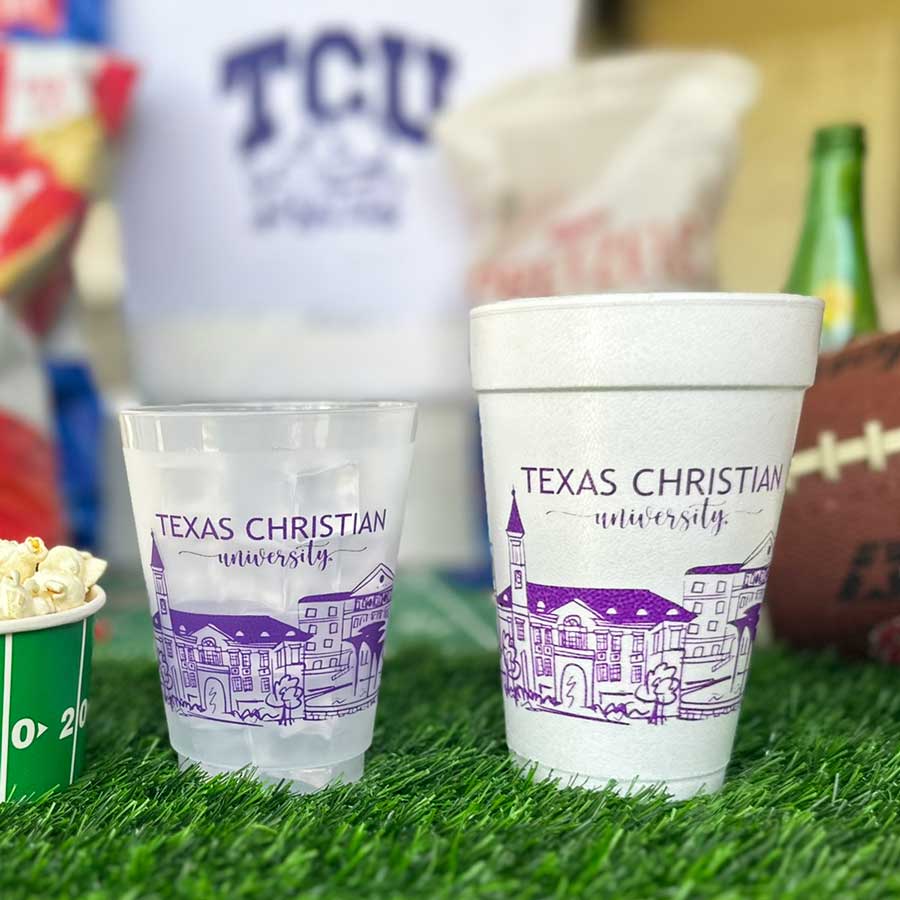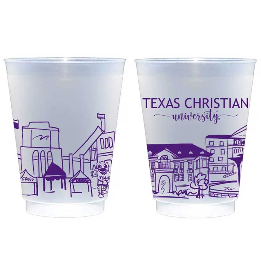 Your TCU Horned Frog celebration becomes more festive with some of the most recognizable landmarks on the Texas Christian University campus and Forth Worth, Texas skyline. These cute roadie cups are are the perfect whimsical touch to your tailgate or TCU Horned Frog graduation party. Our 16-ounce frosted cup packs are pre-printed with the design shown in TCU purple ink and are available in 10 count sleeves. This roadie cup is our most popular size (16 ounce) and can be served across a variety of drinks including beer, mixed drinks or any drink needing ice.
