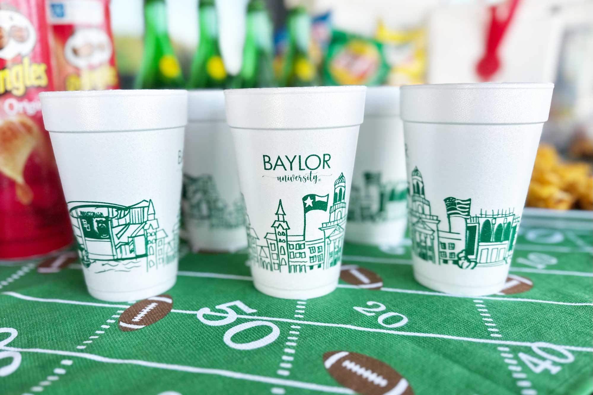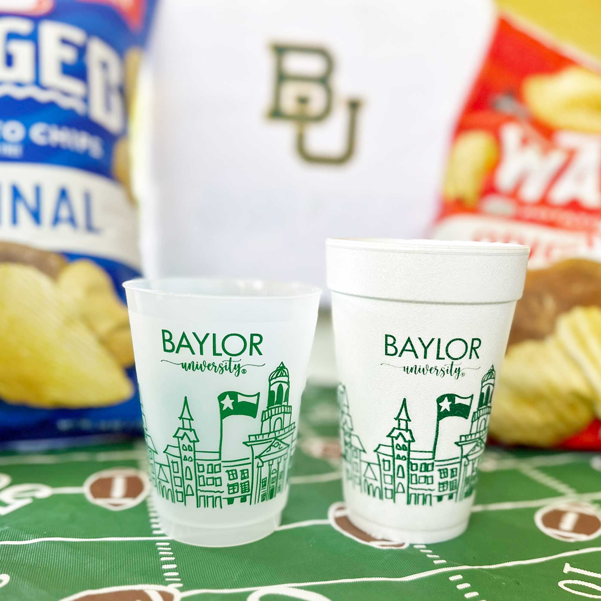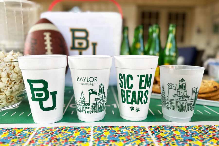 Our 16 ounce foam cup packs are pre-printed with the design shown and are available in 10 count sleeves. Each sleeve is tied with coordinating ribbon, so they are all ready to give as a gift or take to your Baylor Bear football tailgate. This foam cup is our most popular size and can be served across a variety of drinks including beer, mixed drinks or any drink needing ice.