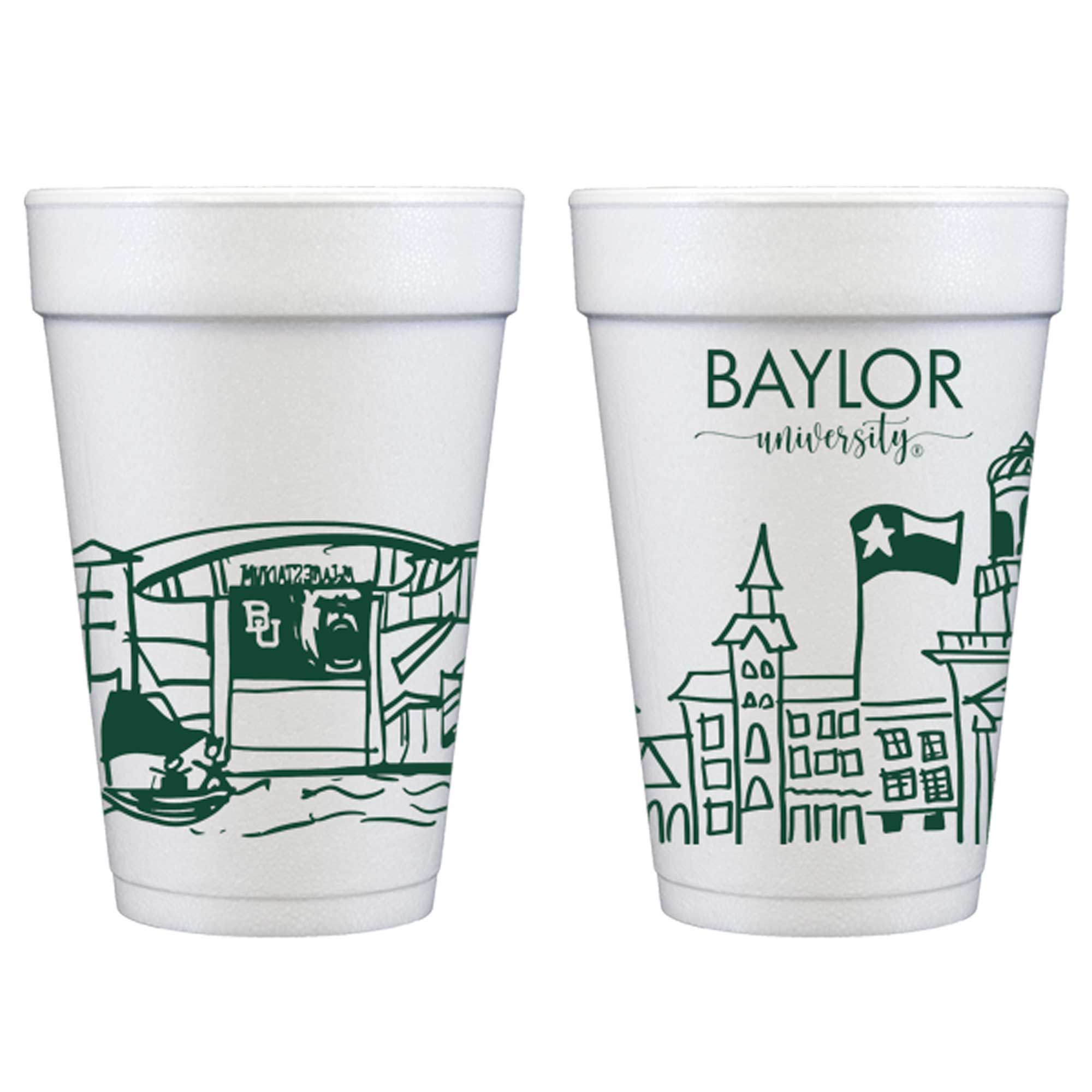 A cute and affordable addition to your Baylor bear celebration – some of the most recognizable landmarks on the Baylor campus in Waco, Texas. From Pat Neff Hall to McLane Football Stadium, these cute campus skyline cups show the following Baylor campus landmarks: