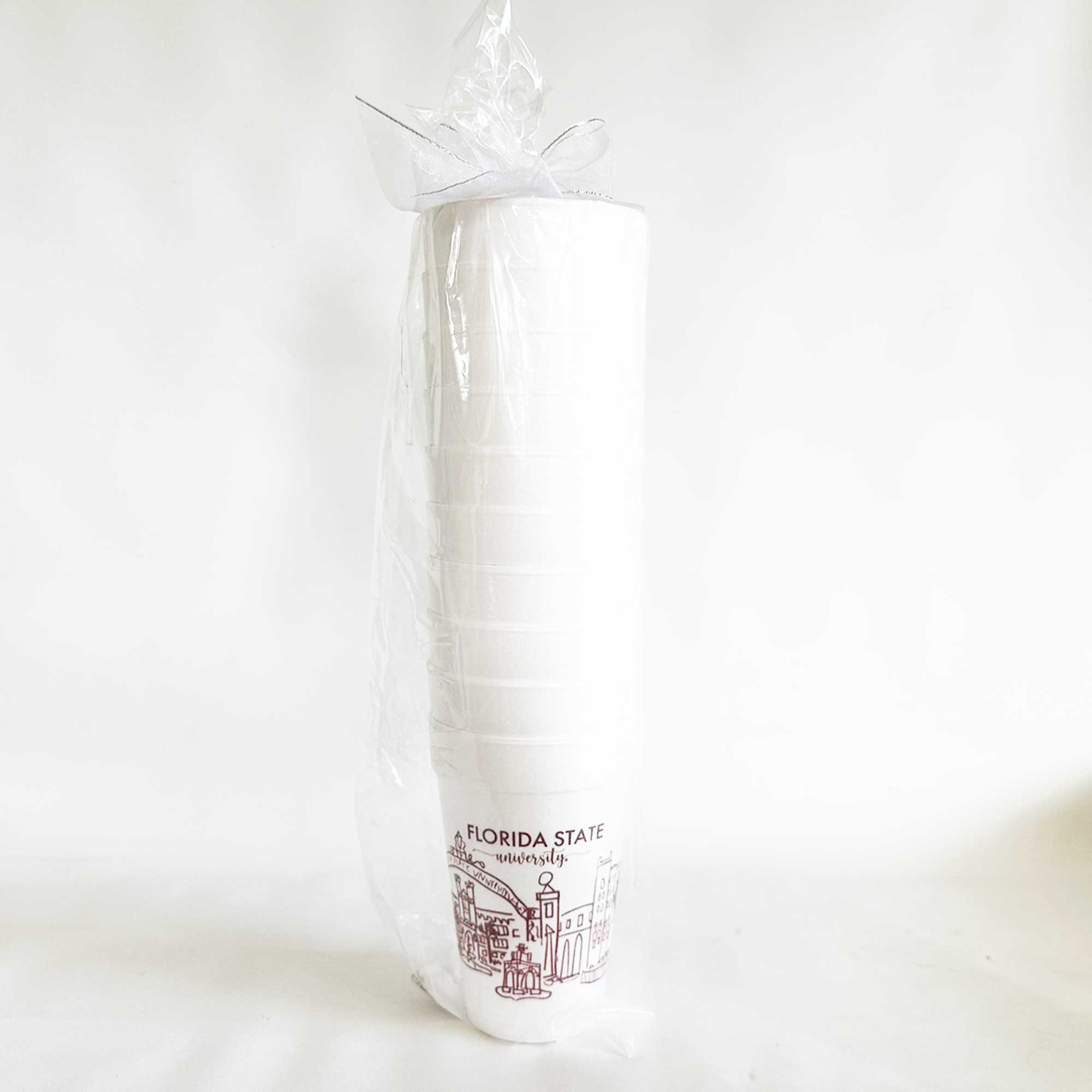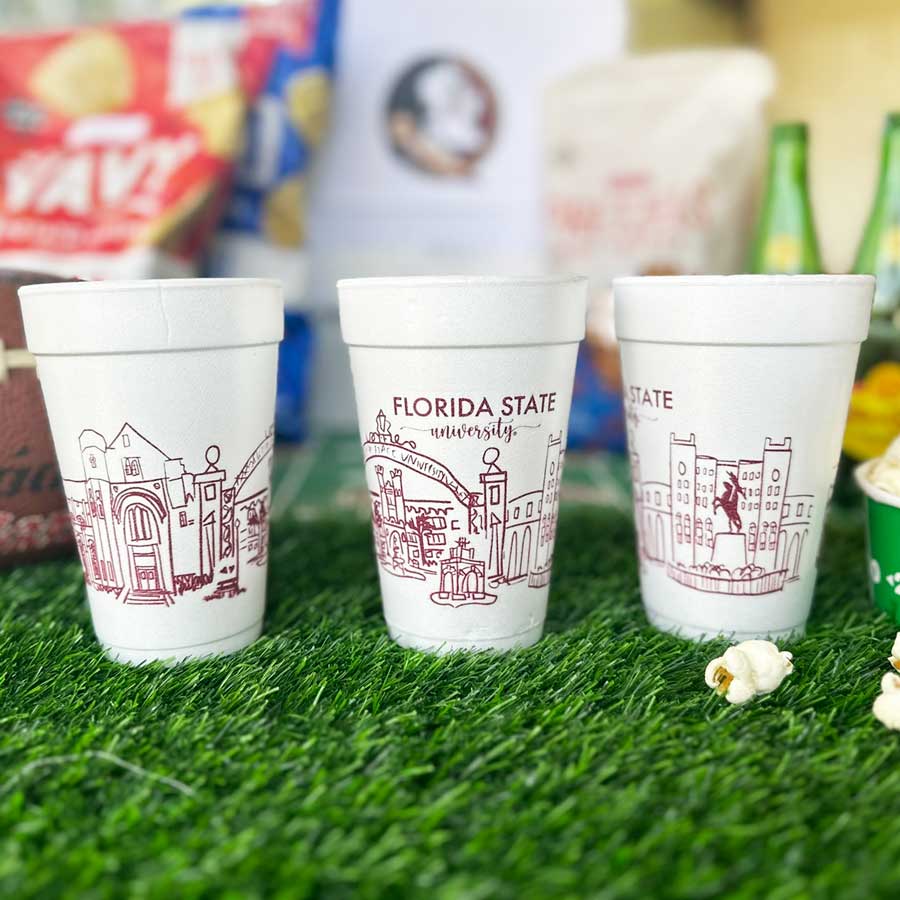 Our 16 ounce foam cup packs are pre-printed with the design shown and are available in 10 count sleeves. Each sleeve is tied with coordinating ribbon, so they are all ready to give as a gift or take to you Florida Seminole football tailgate or graduation party. This foam cup is our most popular size and can be served across a variety of drinks including beer, mixed drinks or any drink needing ice.