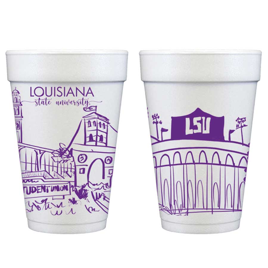 Our 16-ounce foam cup packs are pre-printed with the design shown in purple ink and are available in 10 count sleeves. Each sleeve is tied with a twist tie, so they are ready to give as a gift or take to your LSU football tailgate or graduation party. This foam cup is our most popular size (16oz)Â and can be served across a variety of drinks.