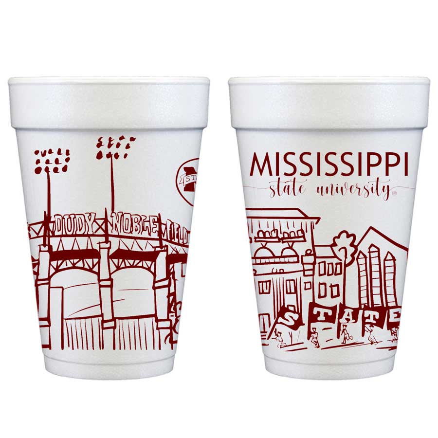 A cute and affordable addition to your Mississippi State Bulldog celebration with some of the most recognizable landmarks on the Mississippi State University campus making the Starkville, Mississippi skyline. These cute foam cups are are the perfect whimsical touch to your tailgate or State graduation party.