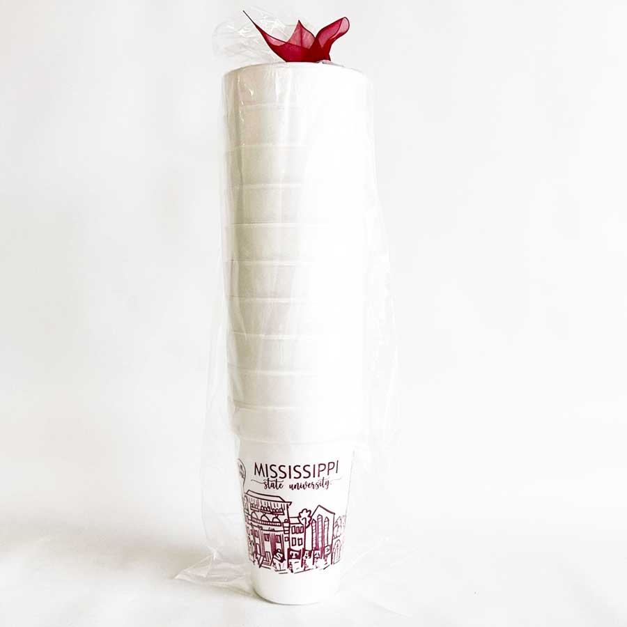 Our 16 ounce foam cup packs are pre-printed with the Starkvile skyline shown and are available in 10 count sleeves. Each sleeve is tied with coordinating maroon ribbon, so they are all ready to give as a gift or take to your football tailgate or Bulldog graduation party. This foam cup is our most popular size and can be served across a variety of drinks including beer, mixed drinks or any drink needing ice.