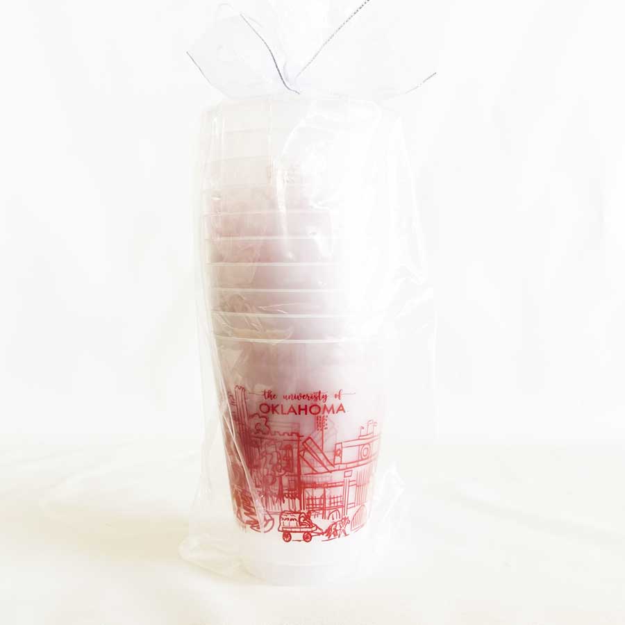 A cute and affordable addition to your Oklahoma University Sooner celebration – either on campus or at home – with some of the most recognizable landmarks on the Oklahoma University campus in Norman, Oklahoma. From Old Central to Student Union, these cute campus skyline cups show the following OU campus landmarks