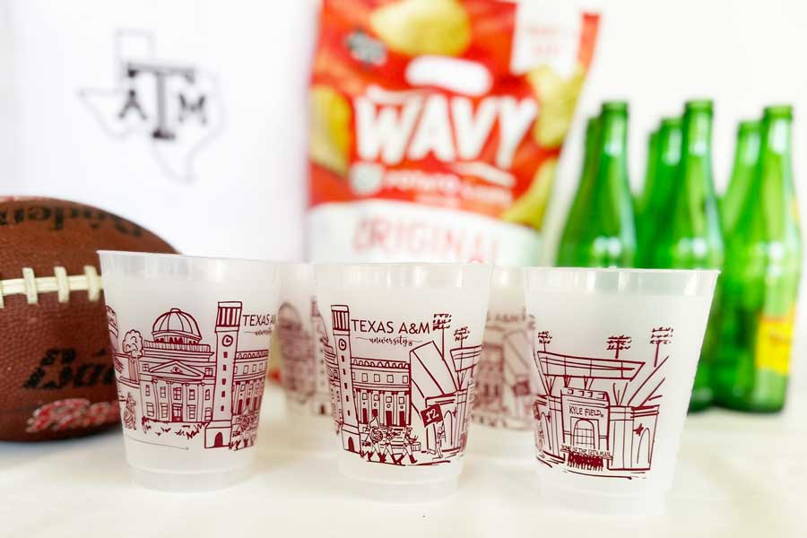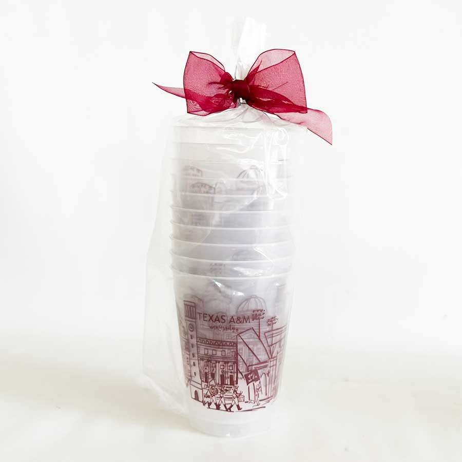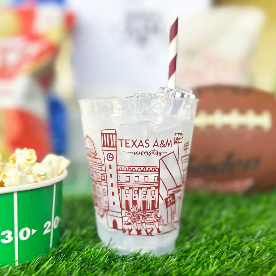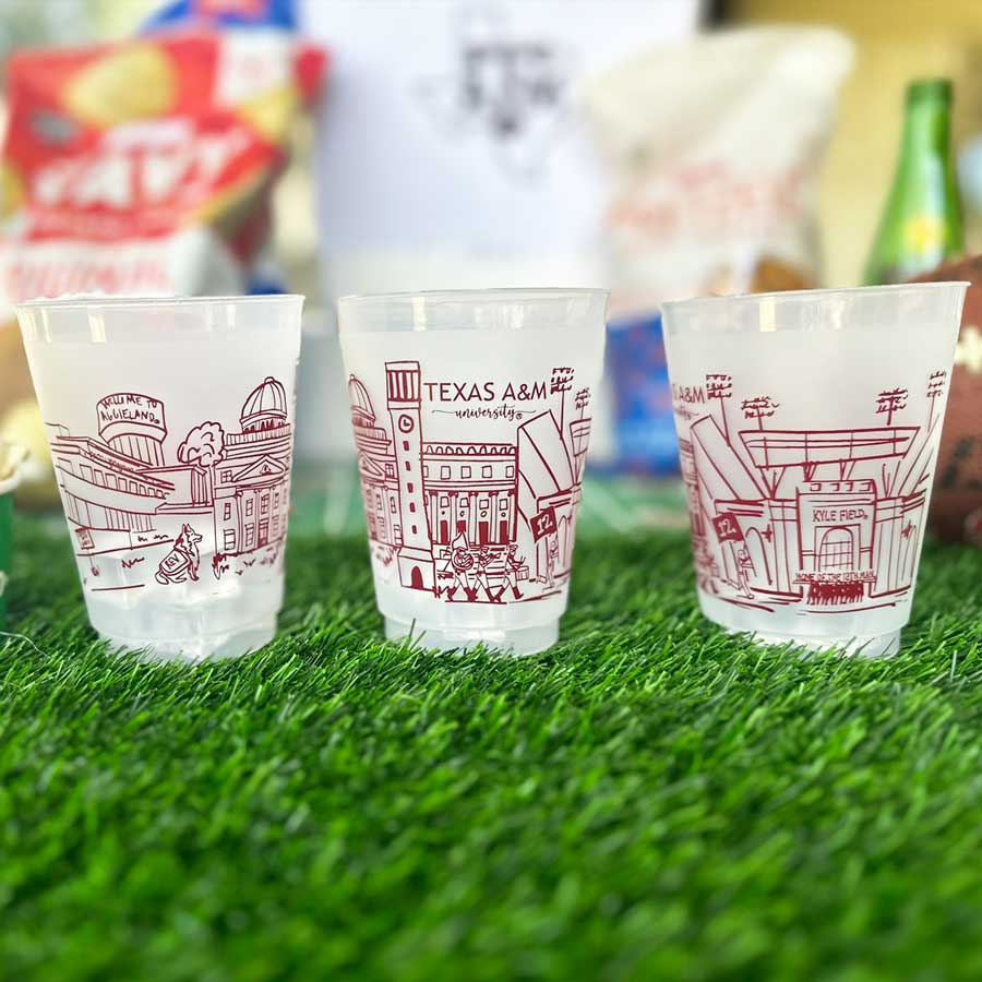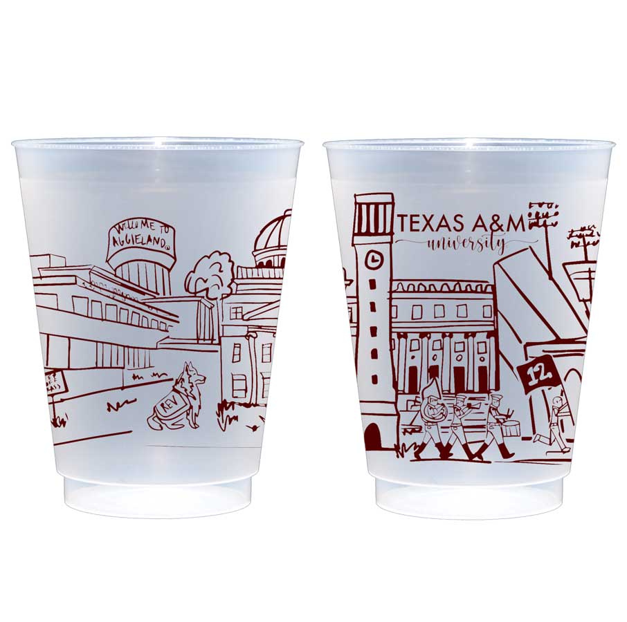 A cute and affordable addition to your Texas A&M Aggie celebration with some of the most recognizable landmarks on the Aggieland campus making the College Station, Texas campus skyline. These cute shatterproof frosted cups are are the perfect whimsical touch to your tailgate or Texas Aggie graduation party.