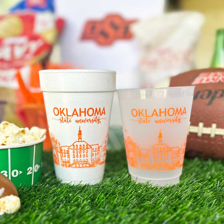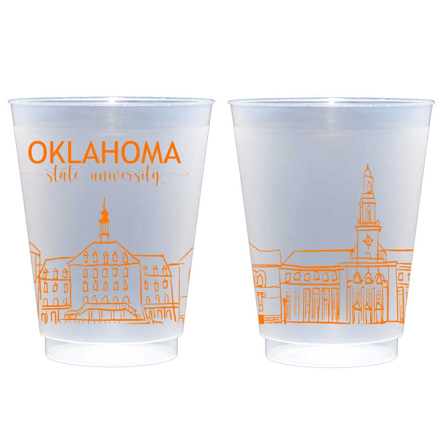 A cute and affordable addition to your Oklahoma State University Cowboy celebration – either on campus or at home – with some of the most recognizable landmarks on the Oklahoma State campus in Stillwater, Oklahoma. From Old Central to Student Union, these cute campus skyline roadie cups show the following Oklahoma State campus landmarks