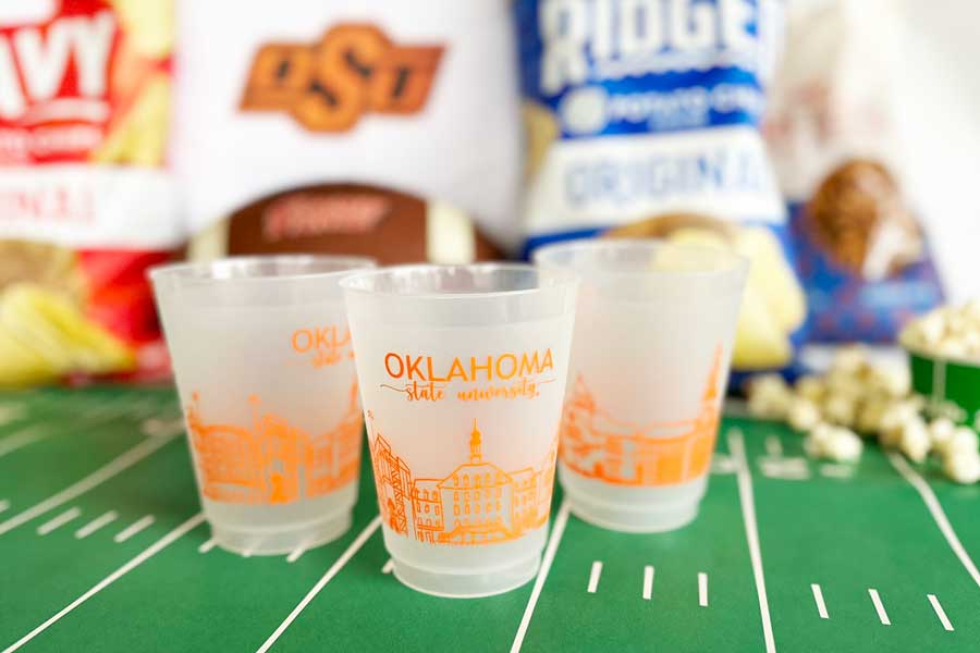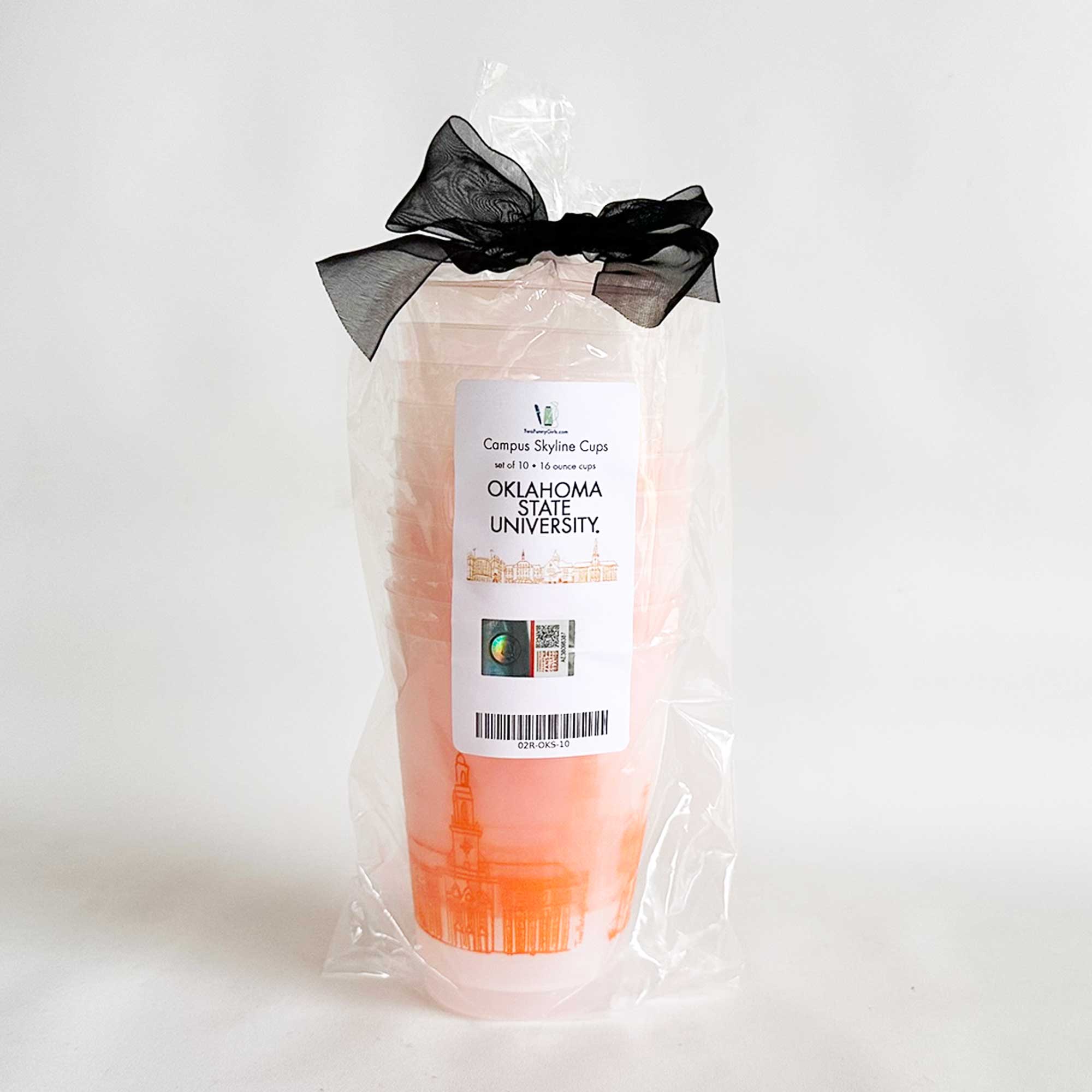 Our 16 ounce plastic frosted shatterproof cup packs are pre-printed with the wrapped design shown and are available in 10 count sleeves. Each sleeve is ready to give as a gift or take to your Oklahoma State University Cowboys football tailgate or graduation party. This frosted cup is our most popular size and can be served across a variety of drinks including beer, mixed drinks or any drink needing ice