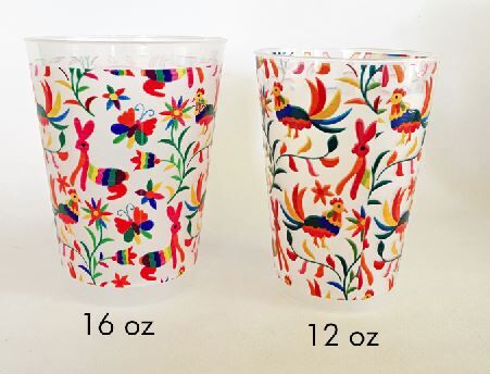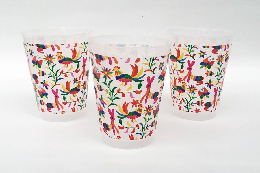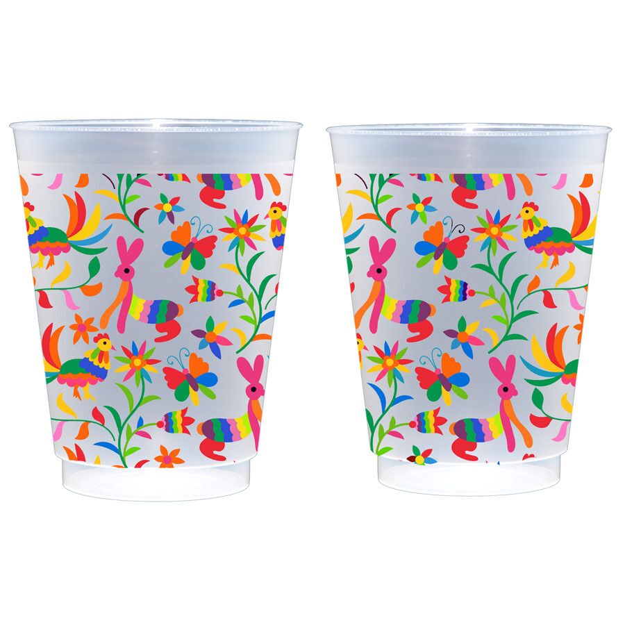 Our Mexican embroidery/Otomi design is printed on frosted shatterproof roadie party cups and are the finishing touch to your Mexican fiesta or Cinco de Mayo party. These frosted roadie cups come in a sleeve of 10 and each cup is wrapped in our colorful Mexican embroidery/Otomi design with brightly colored rabbits roosters, butterflies, flowers and leaves. These also look great on a table with our luncheon sized otomi print napkins.