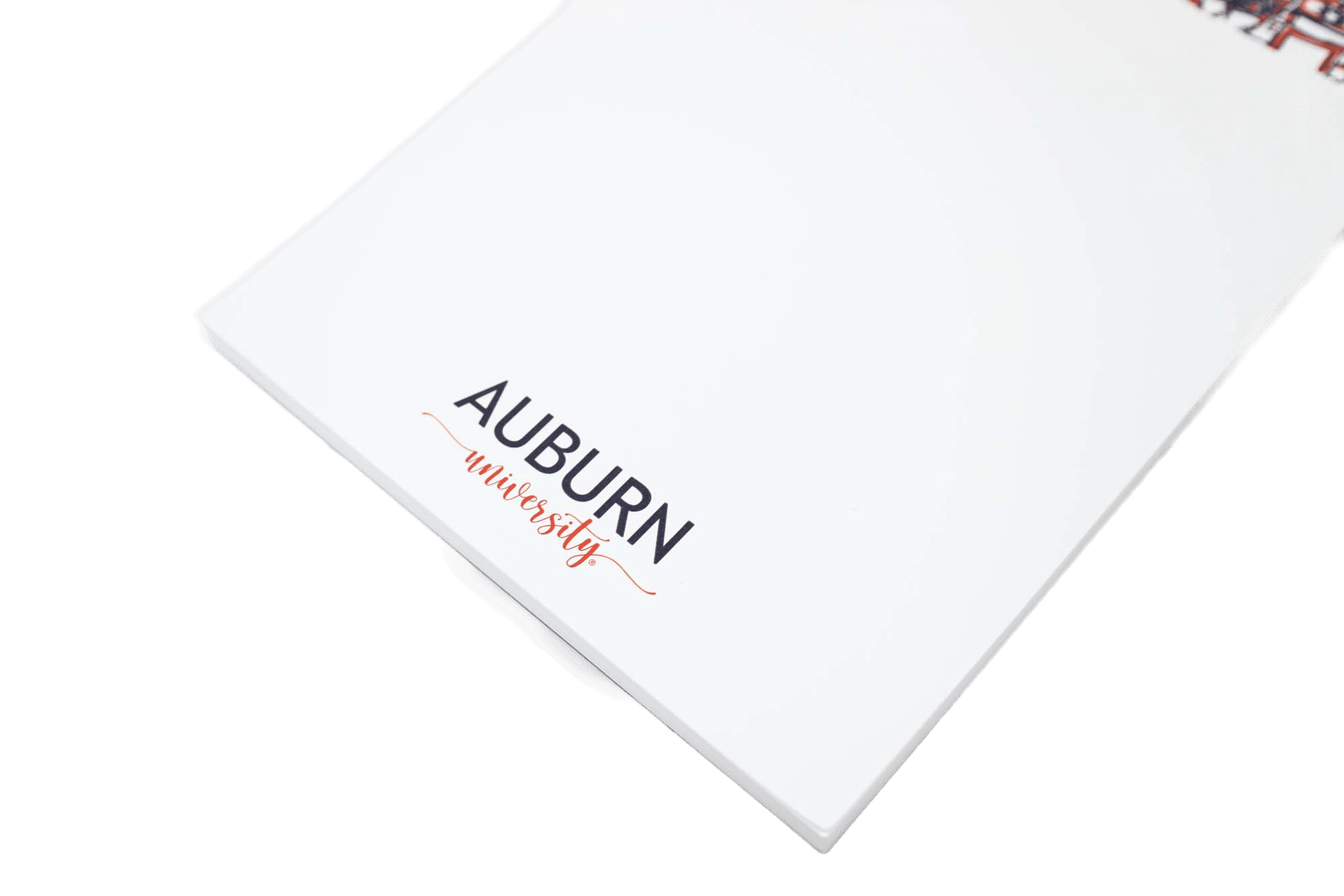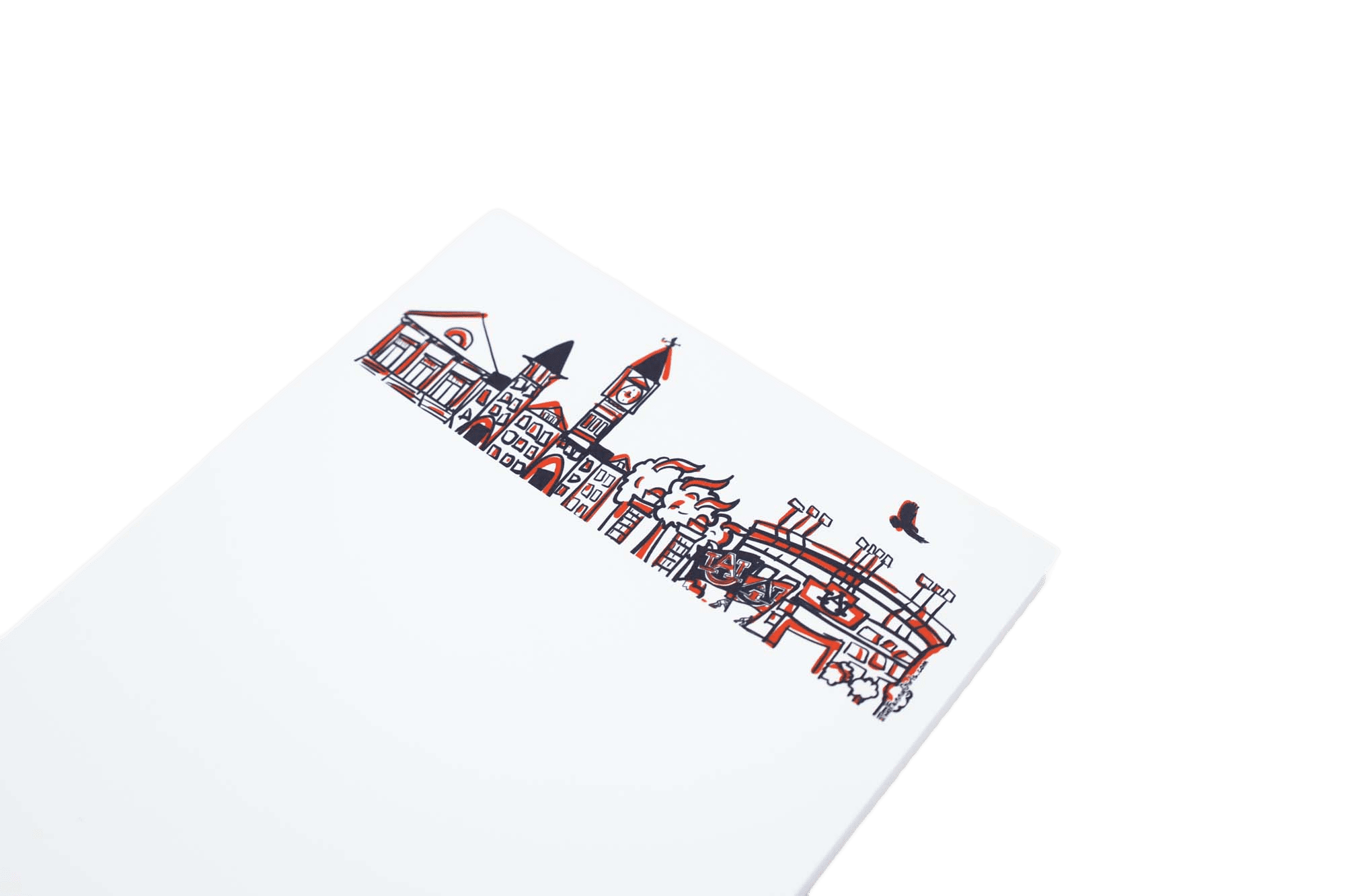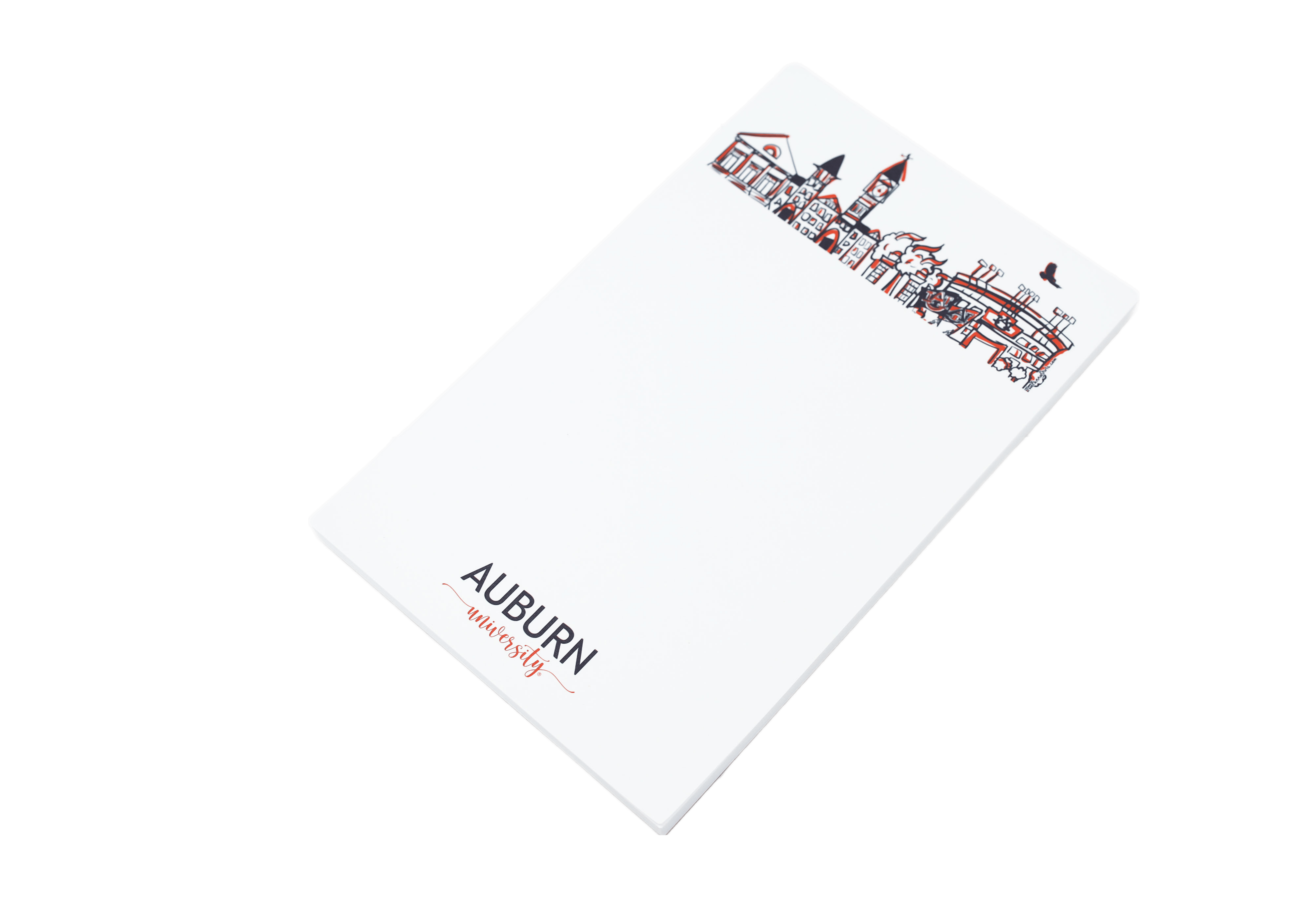 Our ready-to-ship, non-personalized college campus note pads show a hand-drawn landscape of Auburn University campus landmarks in Auburn, Alabama using navy blue ink with orange highlights. “Auburn University” is printed in mixed fonts at the bottom of each notepad. Sold as an individual 50 sheet notepad, it measures 5.5″W x 8.5″H and gummed at the top and backed with a sturdy chipboard.