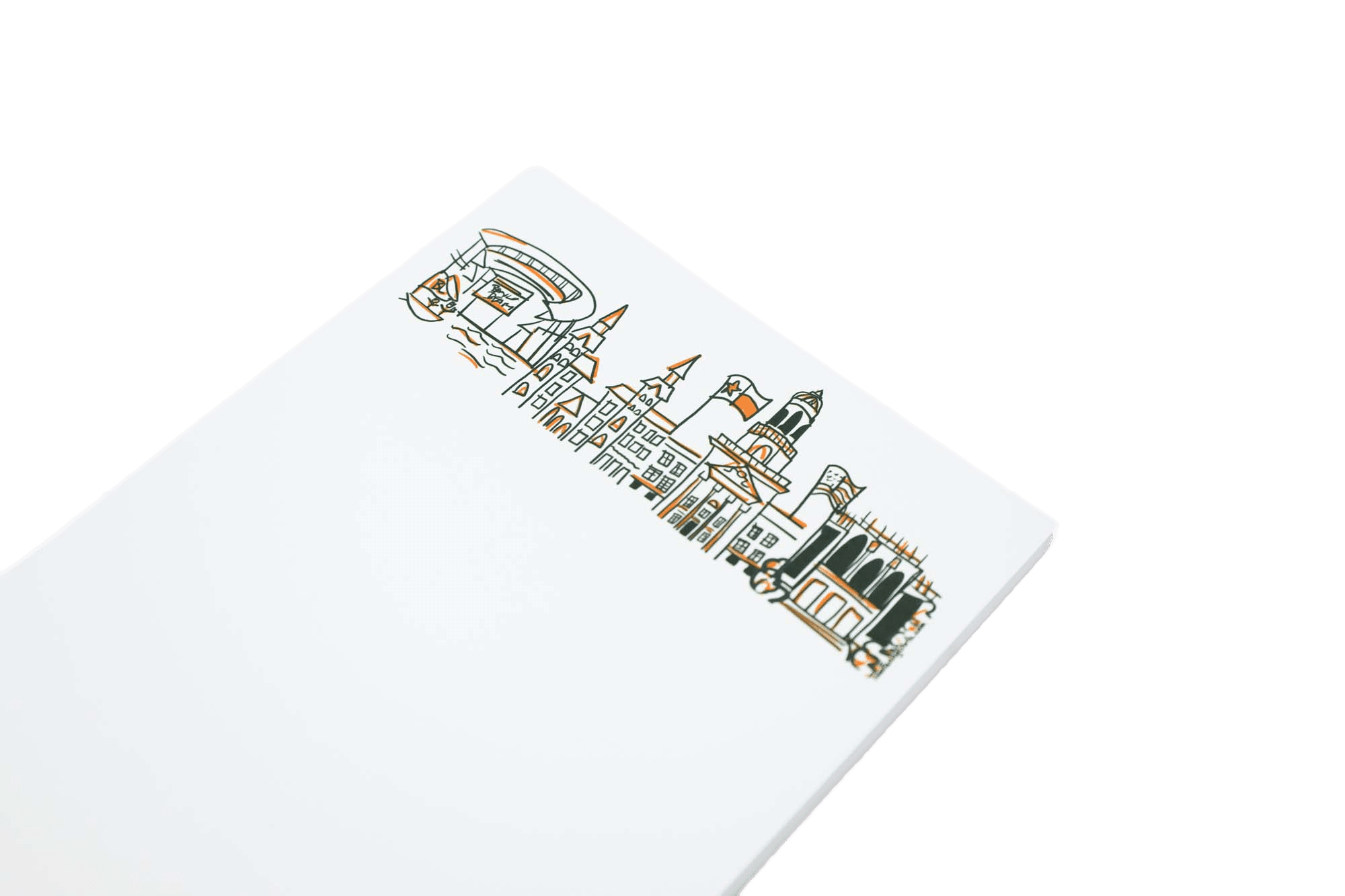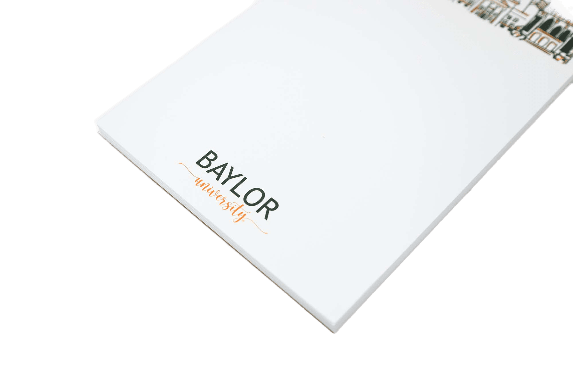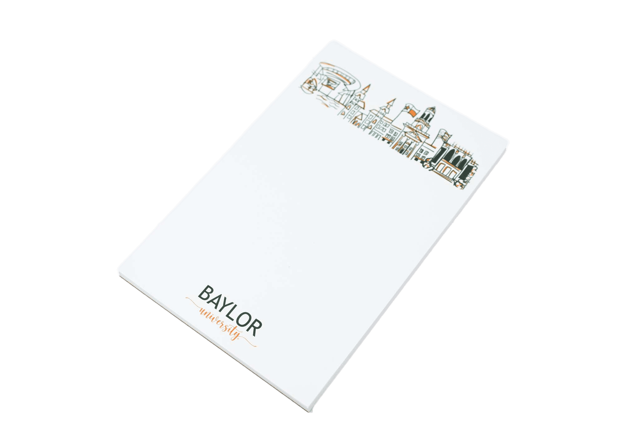 Our ready-to-ship, non-personalized college campus note pad show a hand-drawn landscape of the Baylor campus landmarks in Waco, Texas using mustang green ink with gold highlights. “Baylor University ” is printed in mixed fonts at the bottom of each notepad. Sold as an individual 50 sheet notepad, it measures 5.5″W x 8.5″H and gummed at the top and backed with a sturdy chipboard.