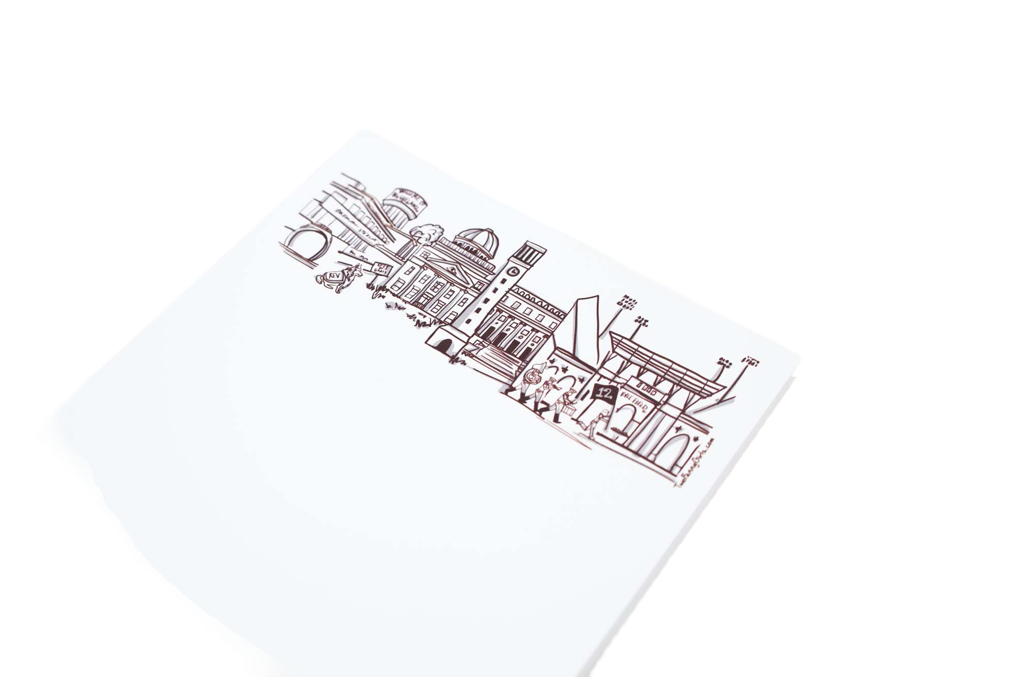 Our ready-to-ship, non-personalized college campus note pads show a hand-drawn landscape of the Texas A&M University campus landmarks in College Station using Aggie Maroon ink with grey highlights. “Texas A&M University ” is printed in mixed fonts at the bottom of each notepad. Sold as an individual 50 sheet notepad, it measures 5.5″W x 8.5″H and gummed at the top and backed with a sturdy chipboard.