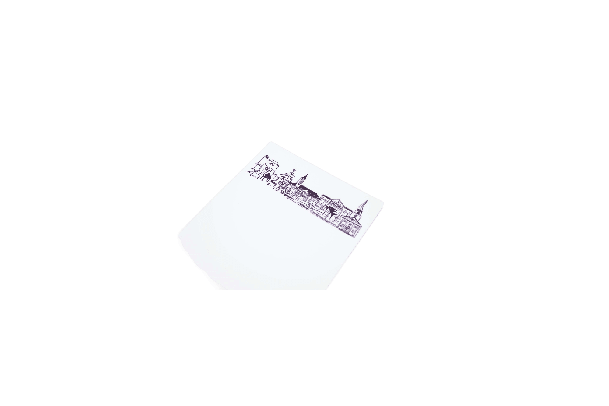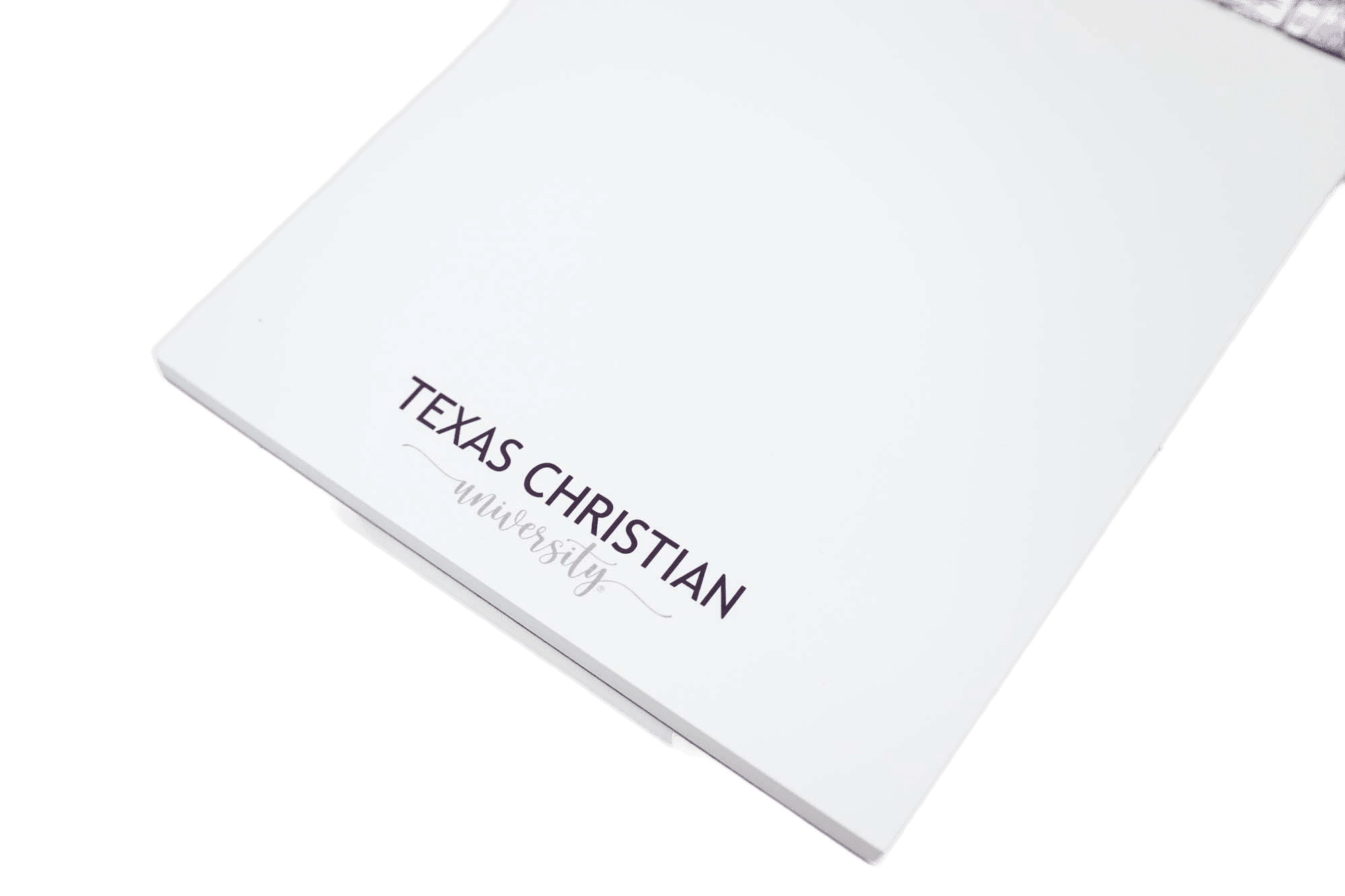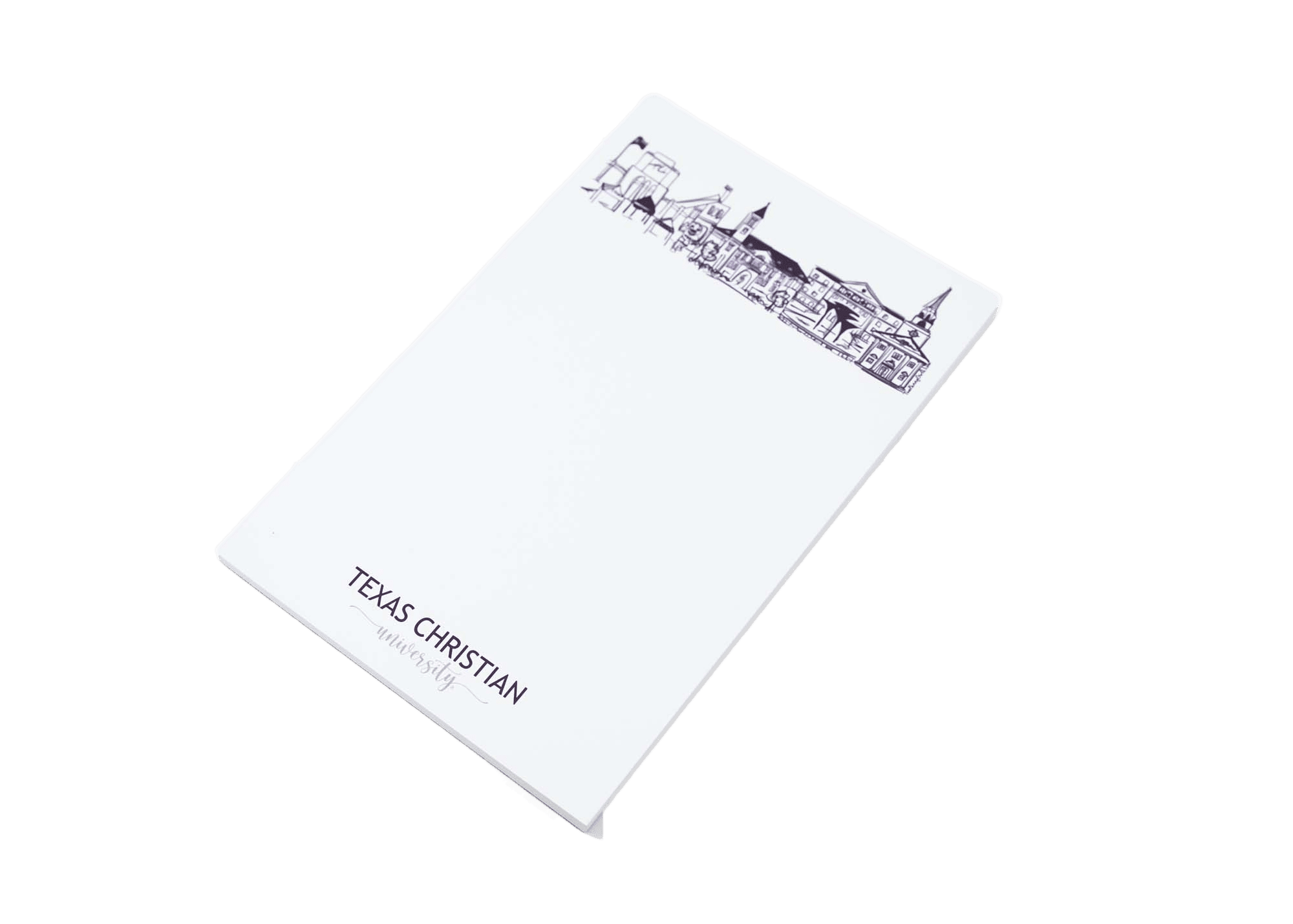 Our ready-to-ship, non-personalized college campus note pad show a hand-drawn landscape of the TCU campus landmarks in Fort Worth, Texas using horned frog purple ink with hrey highlights. “Texas Christian University ” is printed in mixed fonts at the bottom of each notepad. Sold as an individual 50 sheet notepad, it measures 5.5″W x 8.5″H and gummed at the top and backed with a sturdy chipboard.