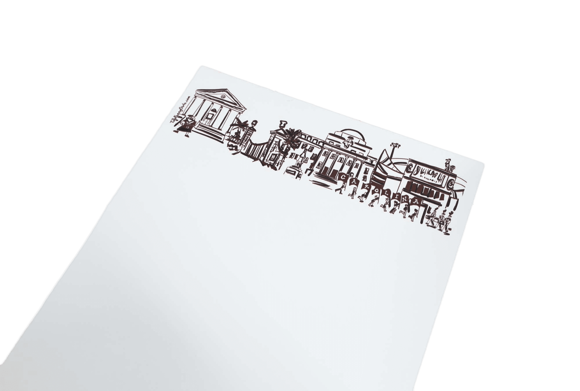 Our ready-to-ship, non-personalized college campus note pad show a hand-drawn landscape of the University of South Carolina campus landmarks in Columbia, South Carolina using orange ink with purple highlights. “University of South Carolina ” is printed in mixed fonts at the bottom of each notepad. Sold as an individual 50 sheet notepad, it measures 5.5″W x 8.5″H and gummed at the top and backed with a sturdy chipboard.