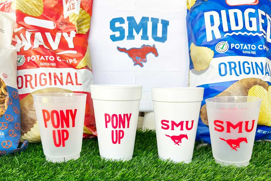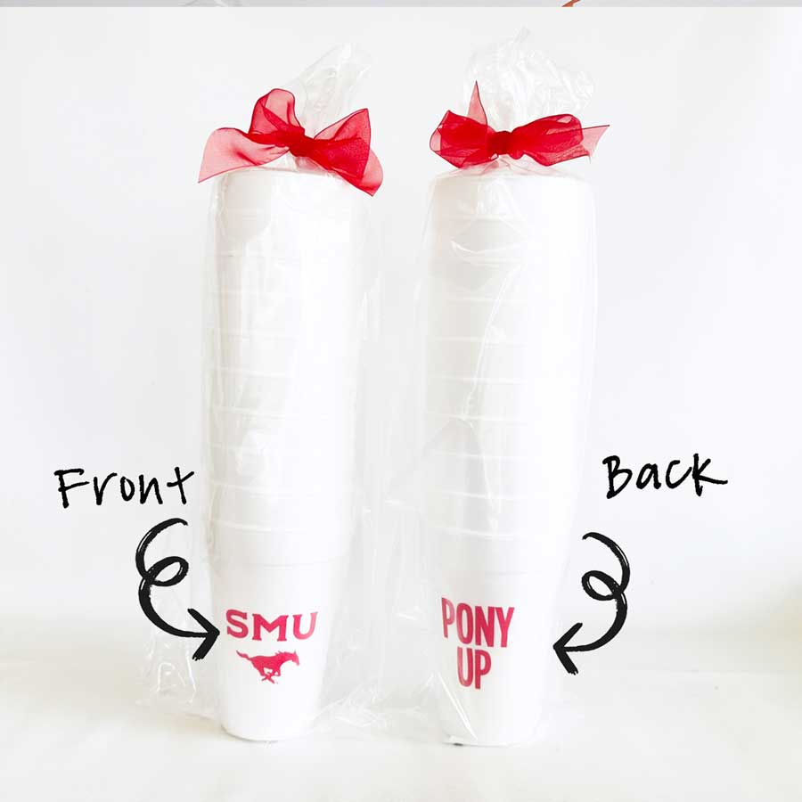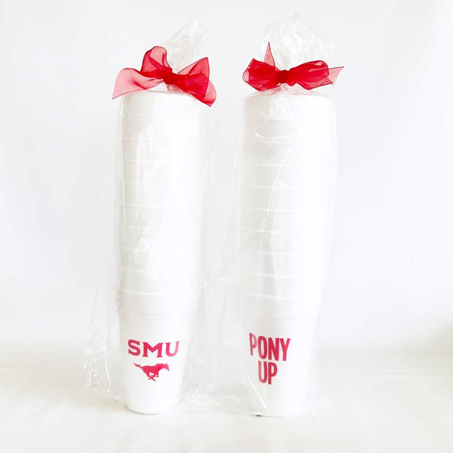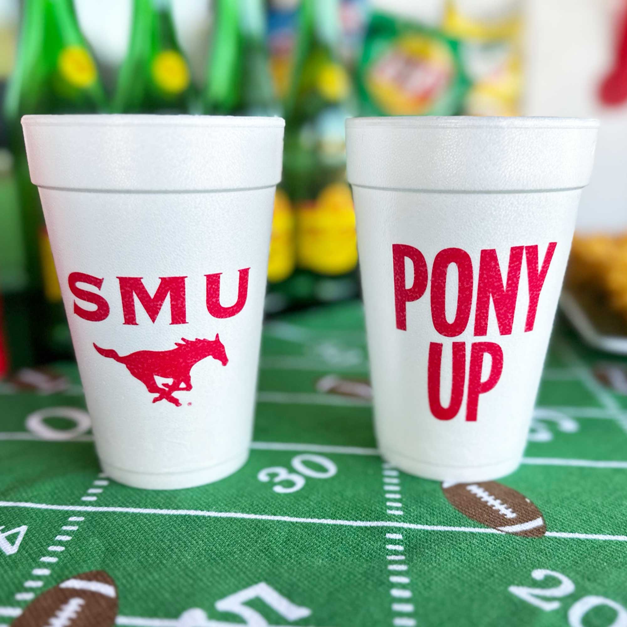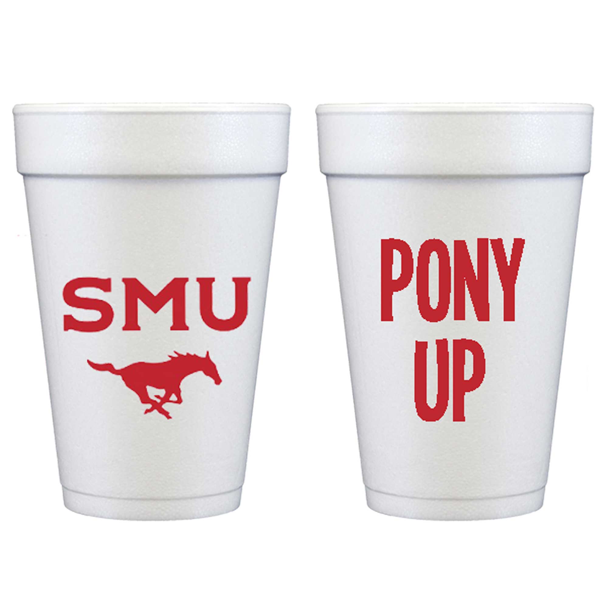 Our SMU foam cups show licensed logos from Southern Methodist University in Dallas, Texas. Printed in mustang red ink these make a great tailgate cup graduation party cup. his foam cup is our most popular size and can be served across a variety of drinks including beer, mixed drinks or any drink needing ice.