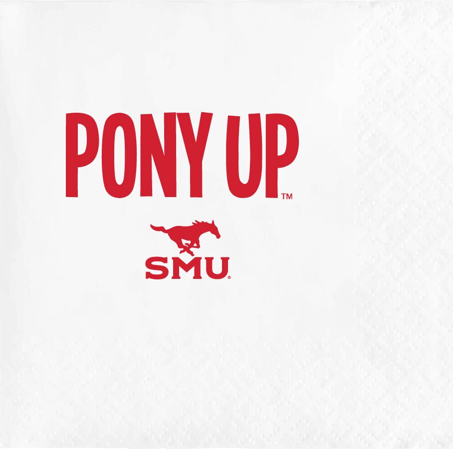 Our Southern Methodist University 3-ply beverage napkin packs show licensed logos from SMUs in Dallas, Texas Printed in mustang red ink, these make a great tailgate or graduation party napkin and match our foam and frost cups in this design.