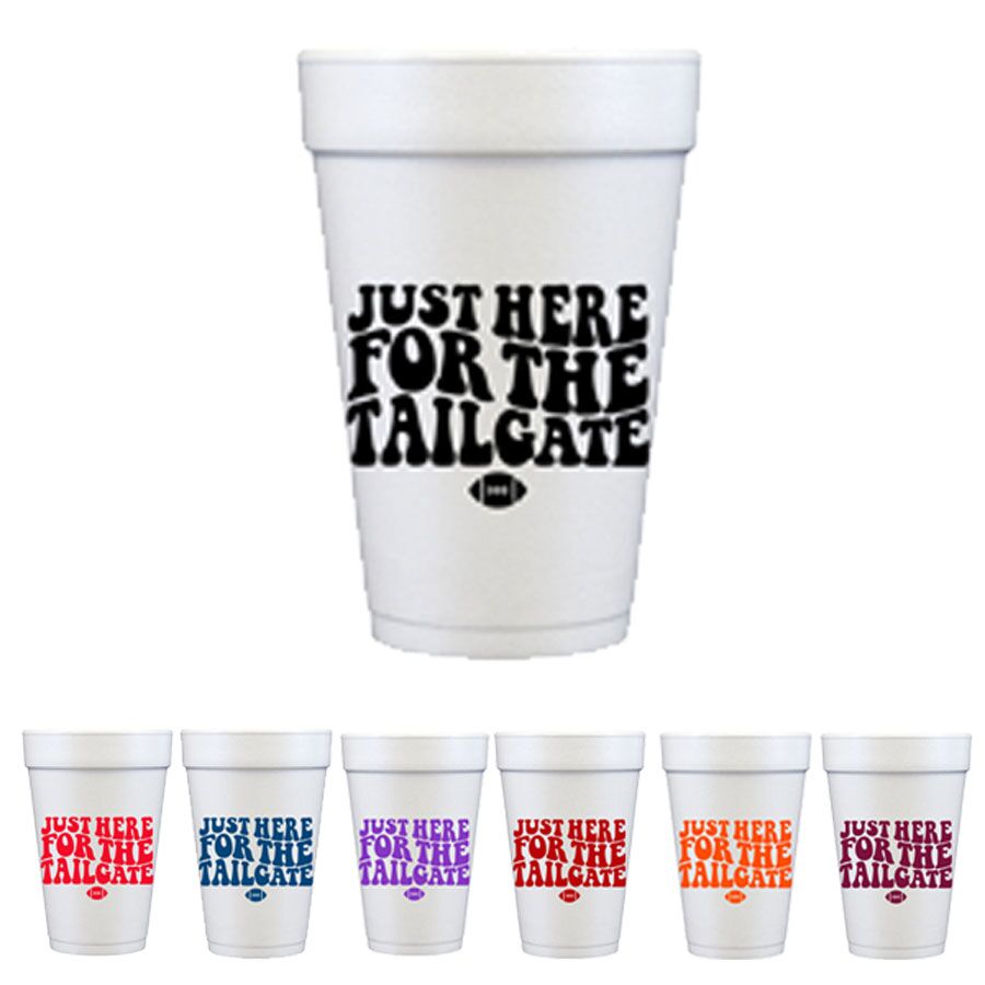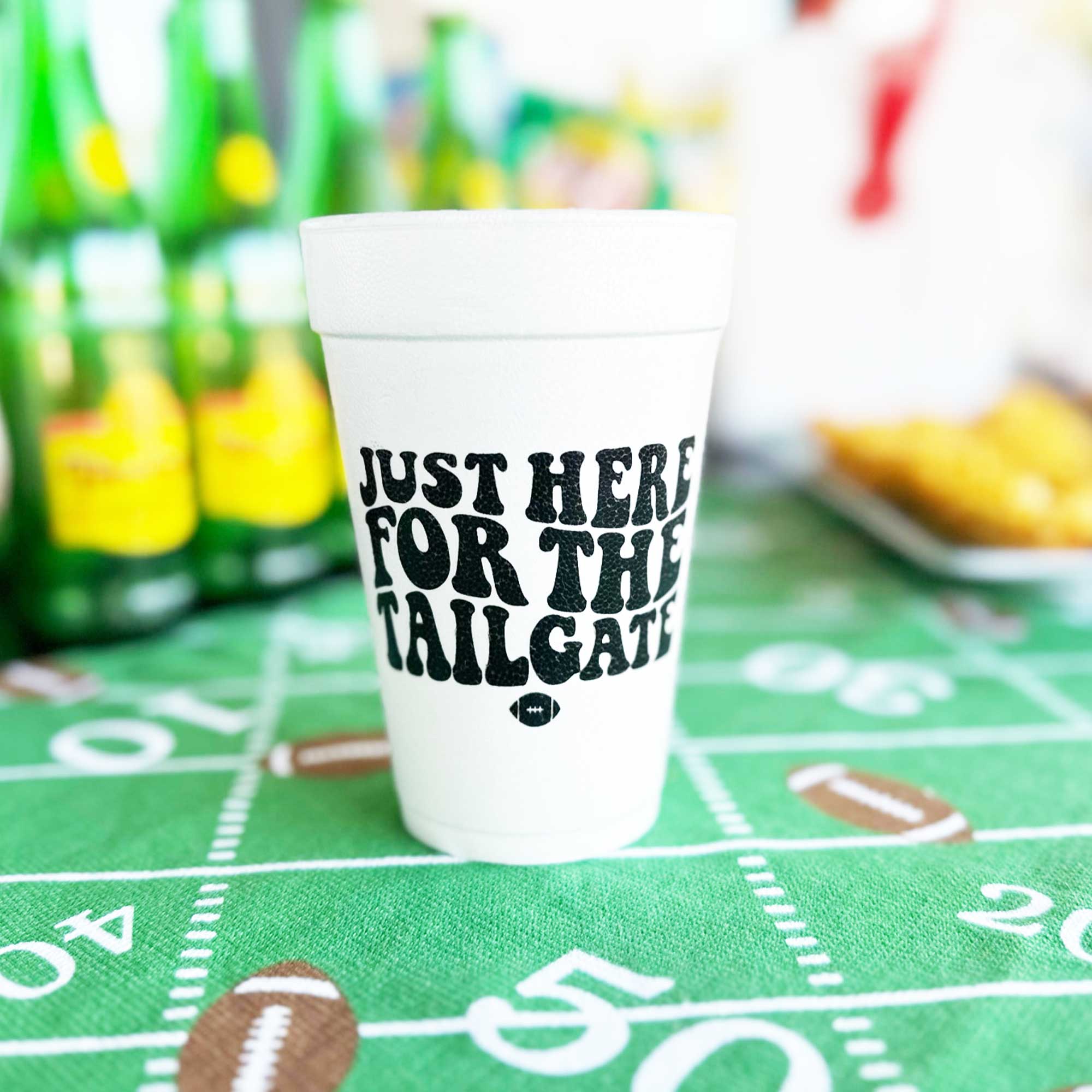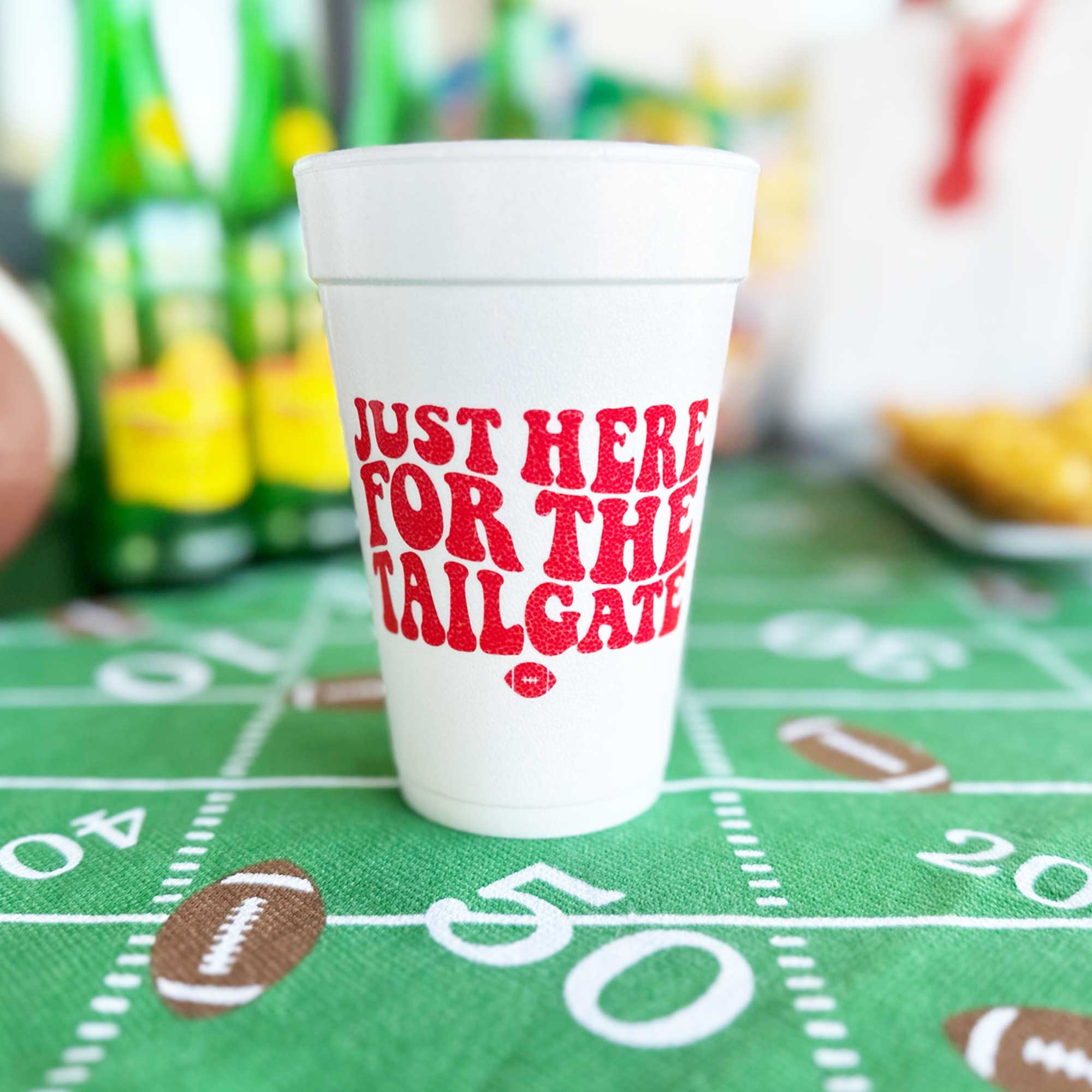 A cute and affordable addition to your football tailgate. These cute foam cups are are the perfect whimsical touch to your tailgate with “Just Here for the Tailgate” written in a retro font in a wave with a football icon at the bottom of the text. Available in the following colors: