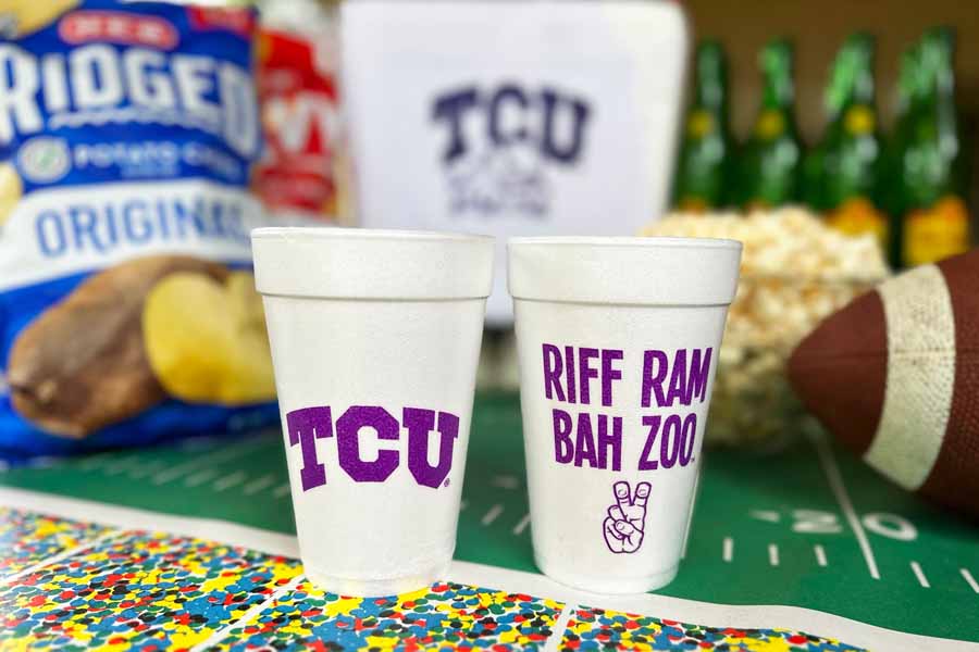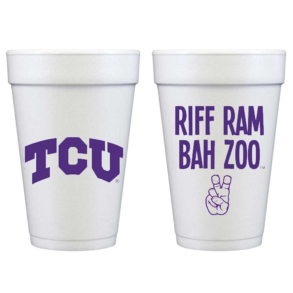 TCU Horned Frog celebrations don’t get any cuter with these official logo foam cup. These festive foam cups are are the perfect whimsical touch to your tailgate or TCU Horned Frog graduation party. Our 16-ounce foam cup packs are pre-printed with the design shown in TCU purple ink and are available in 10 count sleeves. This foam cup is our most popular size and can be served across a variety of drinks including beer, mixed drinks or any drink needing ice.