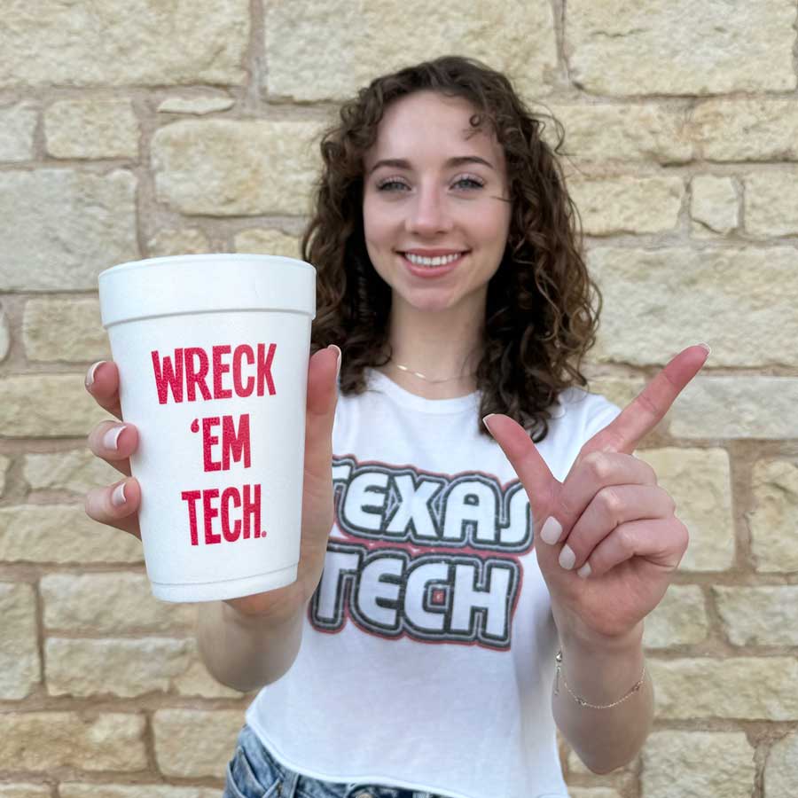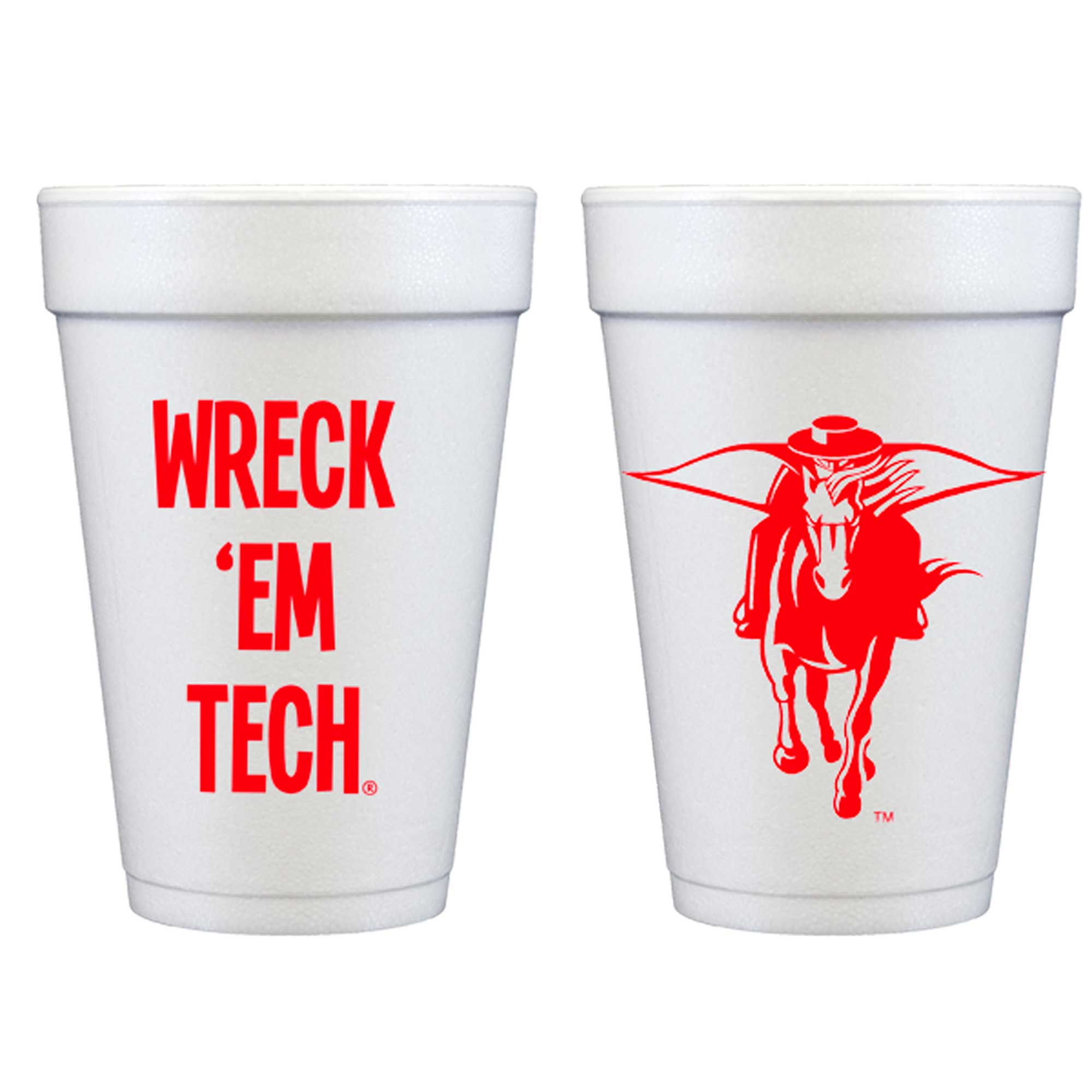 A sleeve of ten 16 oz styrofoam foam cups with the Texas Tech logo on one side and “Wreck ‘Em Tech” on the other side of each cup. Printed in Red Raider red ink, each sleeve has 10 cups and is ready to give as a gift or take to your Texas Tech Red Raider football tailgate or graduation party.
