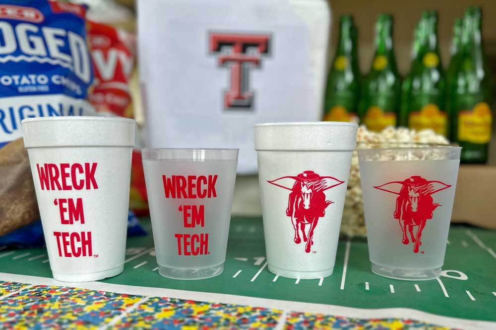 A sleeve of ten 16 oz styrofoam foam cups with the Texas Tech logo on one side and “Wreck ‘Em Tech” on the other side of each cup. Printed in Red Raider red ink, each sleeve has 10 cups and is ready to give as a gift or take to your Texas Tech Red Raider football tailgate or graduation party.