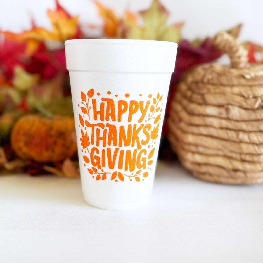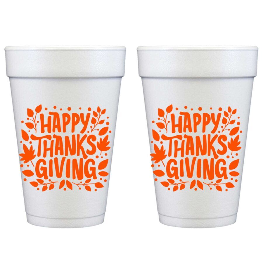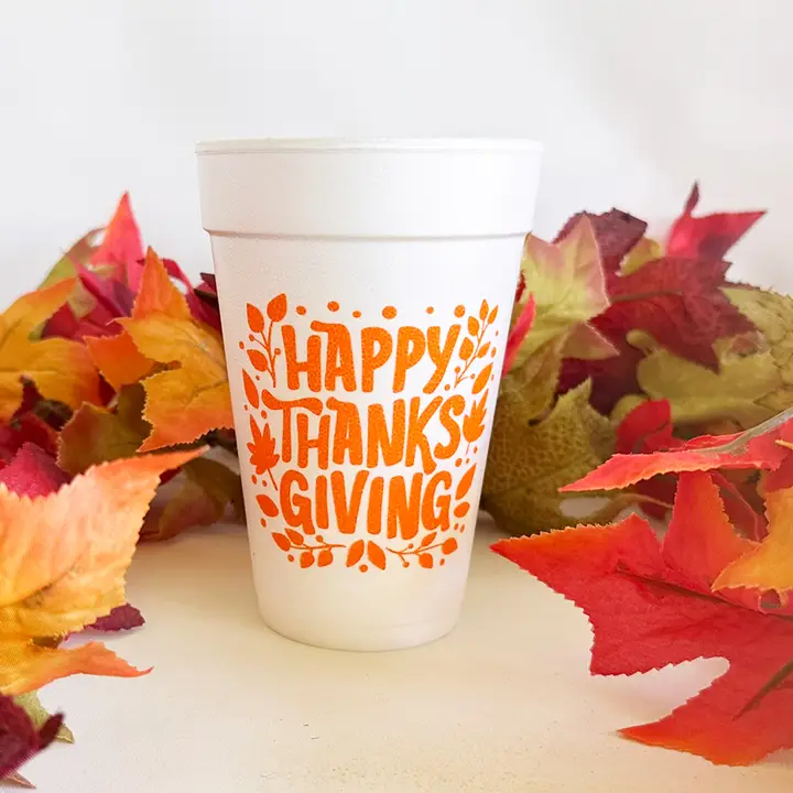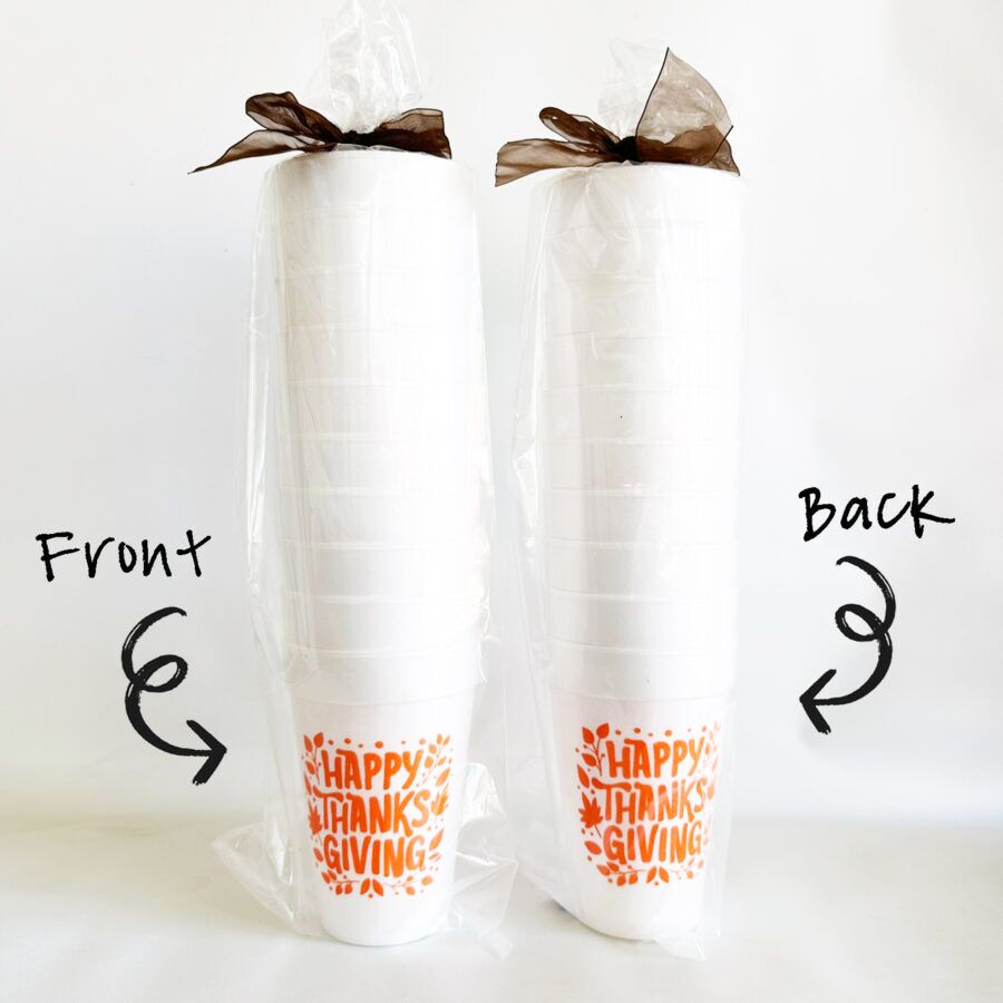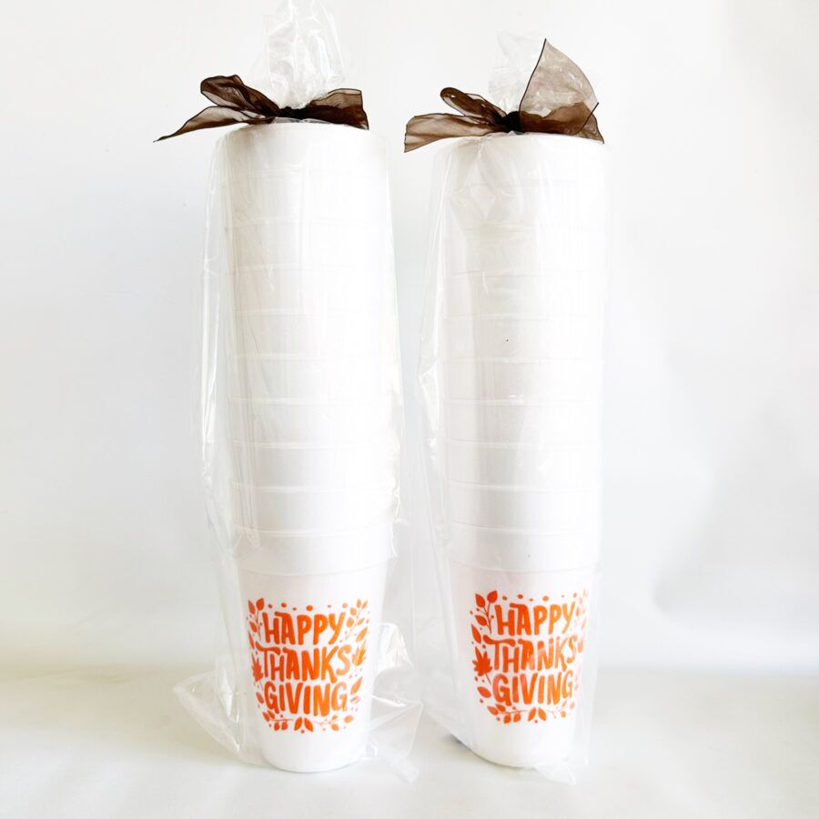 Our 16 ounce Thanksgiving foam cup packs are available in 10 count sleeves. Each cute Thanksgiving cup has “Happy Thanksgiving” surrounded by whimsical leaves in orange ink. Each sleeve of 10 foam cups is tied with coordinating ribbon, so they are all ready to give as a gift.