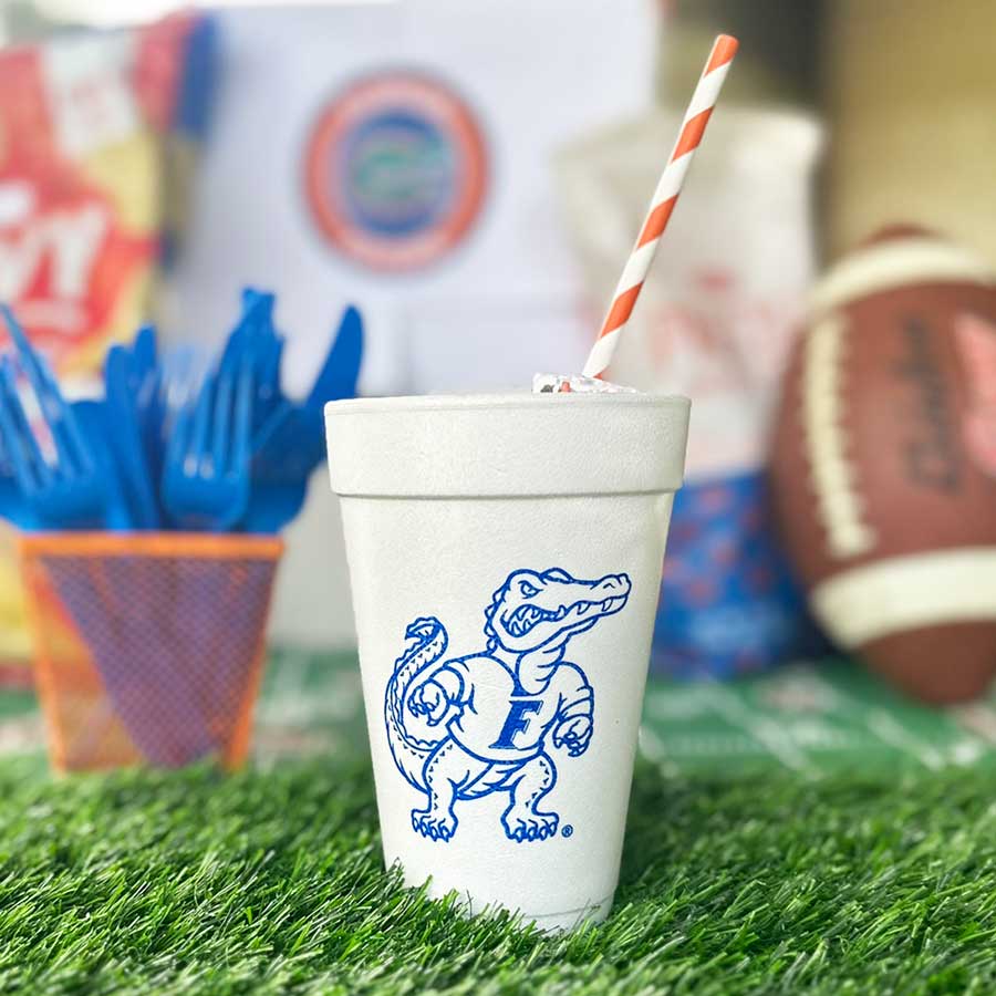 Custom printing available: Looking for a size other than 16 oz or need more than 10 cups and not packaged in bags with a twist tie ribbon? See our bulk printing collegiate logo foam cups page.