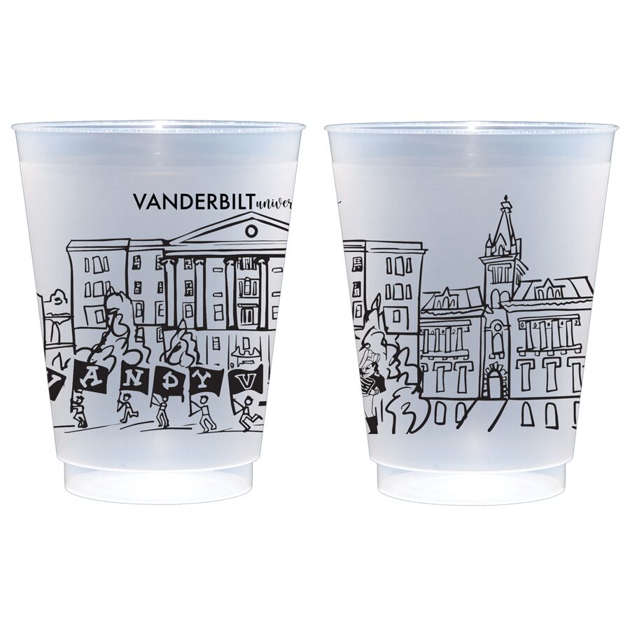 A cute and affordable addition to your Vanderbilt University celebration with some of the most recognizable landmarks on campus making the Nashville, Tennessee campus skyline. These cute shatterproof frosted cups are are the perfect whimsical touch to your tailgate or Vanderbilt Commodore graduation party.