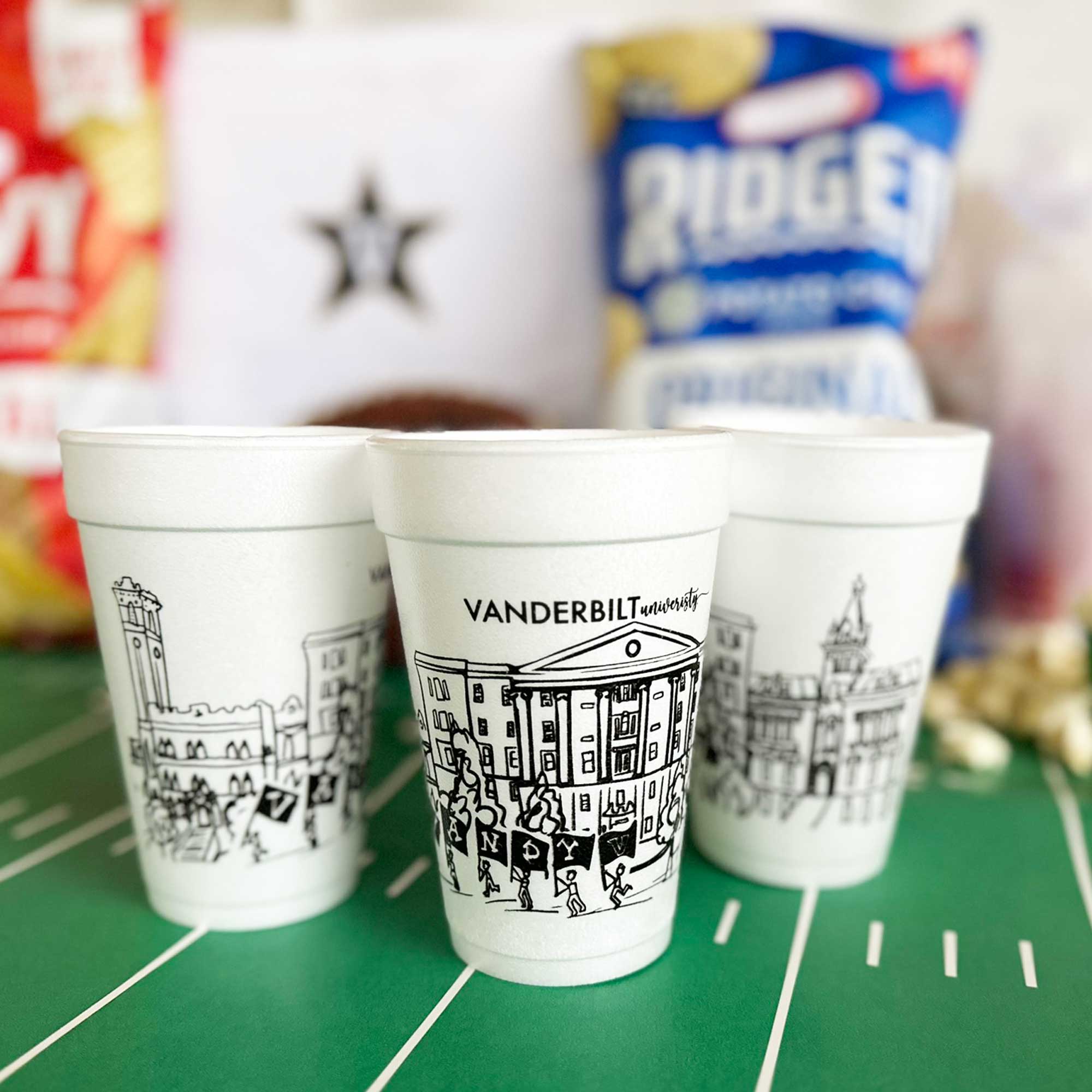 A cute and affordable addition to your Vanderbilt University celebration with some of the most recognizable landmarks making the Nashville, Tennessee campus skyline. These cute styrofoam cups are are the perfect whimsical touch to your VU tailgate or graduation party.